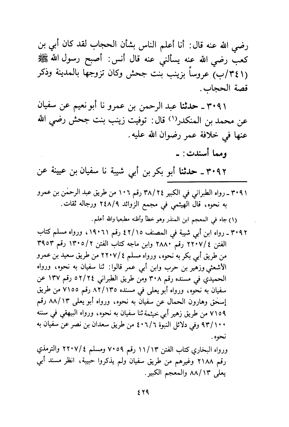 3091 - حَدَّثَنَا عَبْدُ الرَّحْمَنِ بْنُ عَمْرٍو، نا أَبُو نُعَيْمٍ، عَنْ سُفْيَانَ، عَنْ مُحَمَّدِ بْنِ الْمُنْكَدِرِ، قَالَ: §تُوُفِّيَتْ زَيْنَبُ بِنْتُ جَحْشٍ رَضِيَ اللَّهُ عَنْهَا فِي خِلَافَةِ عُمَرَ رِضْوَانُ اللَّهُ عَلَيْهِ وَمِمَّا أَسْنَدَتْ