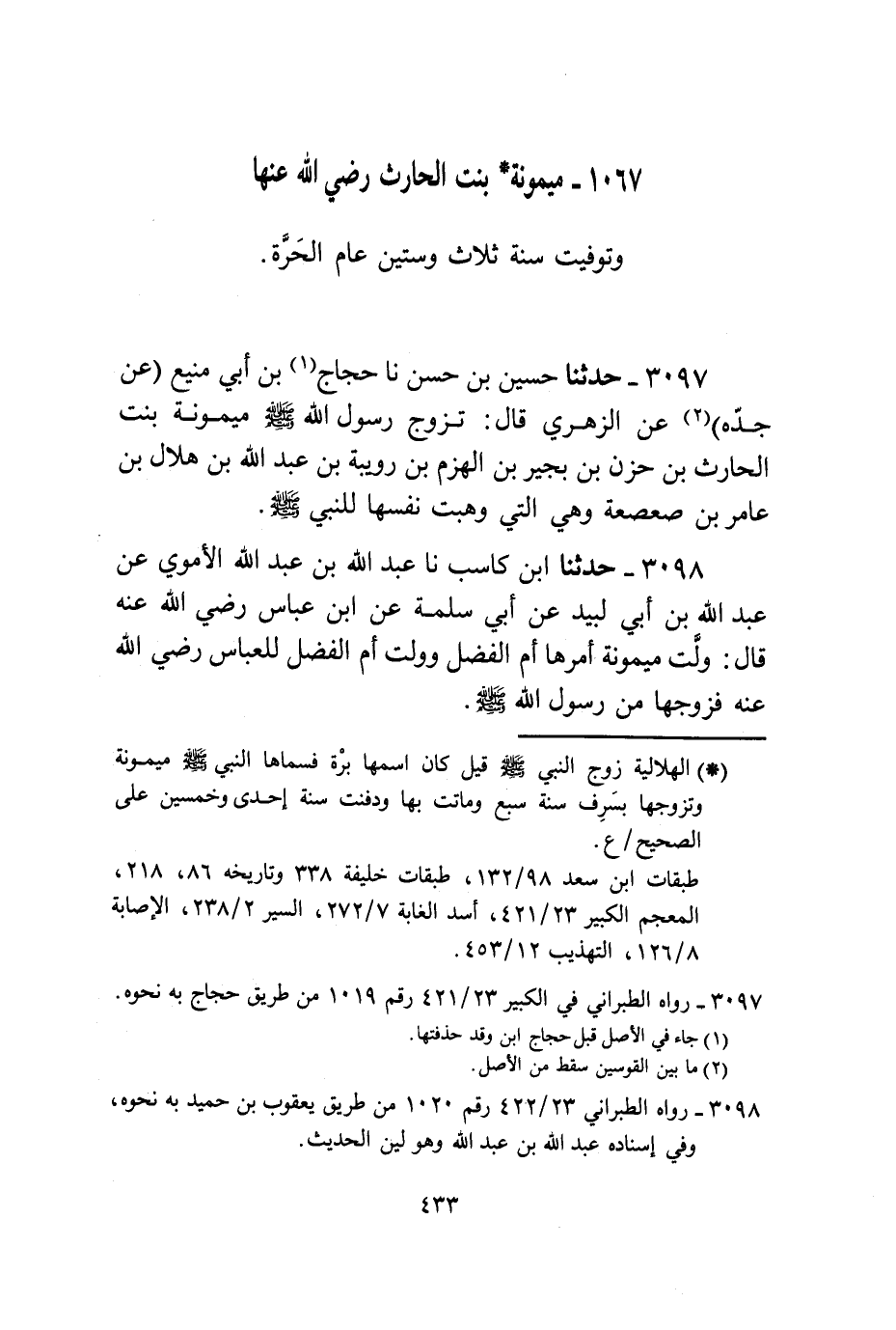 3097 - حَدَّثَنَا حُسَيْنُ بْنُ حَسَنٍ، نا حَجَّاجُ بْنُ أَبِي مَنِيعٍ، عَنْ جَدِّهِ، عَنِ الزُّهْرِيِّ، قَالَ: §تَزَوَّجَ رَسُولُ اللَّهِ صَلَّى اللهُ عَلَيْهِ وَسَلَّمَ مَيْمُونَةَ بِنْتَ الْحَارِثِ بْنِ حَزْنِ بْنِ بُجَيْرِ بْنِ الْهَزْمِ بْنِ رُوَيْبَةَ بْنِ عَبْدِ اللَّهِ بْنِ هِلَالِ بْنِ عَامِرِ بْنِ صَعْصَعَةَ وَهِيَ الَّتِي وَهَبَتْ نَفْسَهَا لِلنَّبِيِّ صَلَّى اللهُ عَلَيْهِ وَسَلَّمَ "
