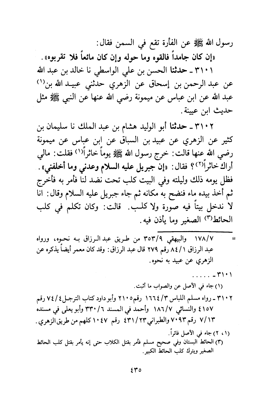 3102 - حَدَّثَنَا أَبُو الْوَلِيدِ هِشَامُ بْنُ عَبْدِ الْمَلِكِ، نا سُلَيْمَانُ بْنُ كَثِيرٍ، عَنِ الزُّهْرِيِّ، عَنْ عُبَيْدِ بْنِ السَّبَّاقِ، عَنِ ابْنِ عَبَّاسٍ، عَنْ مَيْمُونَةَ، رَضِيَ اللَّهُ عَنْهَا قَالَتْ: خَرَجَ رَسُولُ اللَّهِ صَلَّى اللهُ عَلَيْهِ وَسَلَّمَ يَوْمًا خَاثِرًا فَقُلْتُ: مَالِي أَرَاكَ خَاثِرًا؟ فَقَالَ: §إِنَّ جِبْرِيلَ عَلَيْهِ السَّلَامُ وَعَدَنِي وَمَا أَخْلَفَنِي " فَظَلَّ يَوْمَهُ ذَلِكَ وَلَيْلَتَهُ وَفِي الْبَيْتِ كَلْبٌ تَحْتَ نَضَدٍ لَنَا فَأَمَرَ بِهِ فَأُخْرِجَ ثُمَّ أَخَذَ بِيَدِهِ مَاءً فَنَضَحَ بِهِ مَكَانَهُ ثُمَّ جَاءَ جِبْرِيلُ عَلَيْهِ السَّلَامُ وَقَالَ: إِنَّا لَا نَدْخُلُ بَيْتًا فِيهِ صُورَةٌ وَلَا كَلْبٌ. قَالَتْ: وَكَانَ تَكَلَّمَ فِي كَلْبِ الْحَائِطِ الصَّغِيرِ وَمَا يَأْذَنُ فِيهِ "