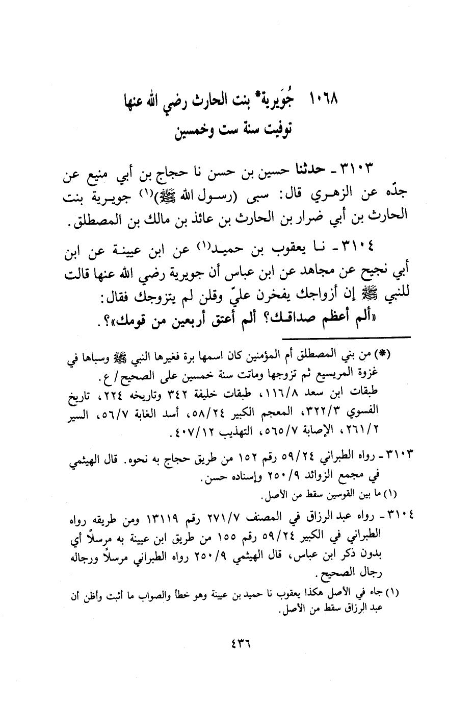 3103 - حَدَّثَنَا حُسَيْنُ بْنُ حَسَنٍ، نا حَجَّاجُ بْنُ أَبِي مَنِيعٍ، عَنْ جَدِّهِ، عَنِ الزُّهْرِيِّ، قَالَ: §سَبَى رَسُولُ اللَّهِ صَلَّى اللهُ عَلَيْهِ وَسَلَّمَ جُوَيْرِيَةَ بِنْتَ الْحَارِثِ بْنِ أَبِي ضِرَارِ بْنِ الْحَارِثِ بْنِ عَائِذِ بْنِ مَالِكِ بْنِ الْمُصْطَلِقِ "