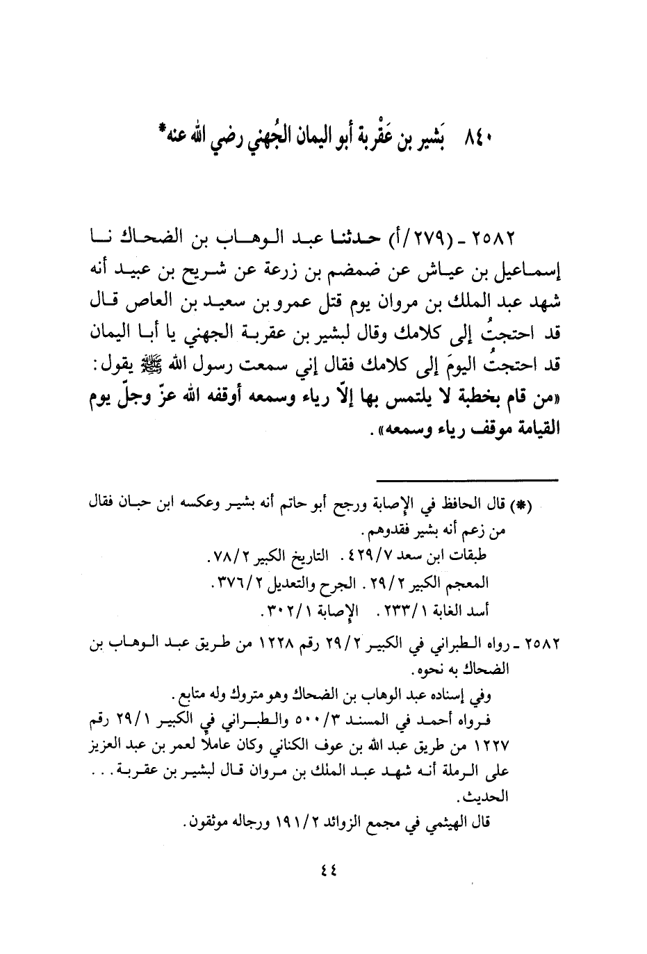 2582 - حَدَّثَنَا عَبْدُ الْوَهَّابِ بْنُ الضَّحَّاكِ، نا إِسْمَاعِيلُ بْنُ عَيَّاشٍ، عَنْ ضَمْضَمِ بْنِ زُرْعَةَ، عَنْ شُرَيْحِ بْنِ عُبَيْدٍ، أَنَّهُ شَهِدَ عَبْدَ الْمَلِكِ بْنَ مَرْوَانَ يَوْمَ قُتِلَ عَمْرُو بْنُ سَعِيدِ بْنِ الْعَاصِ قَالَ: قَدِ احْتَجْتُ إِلَى كَلَامِكَ. وَقَالَ لِبَشِيرِ بْنِ عَقْرَبٍ الْجُهَنِيِّ: يَا أَبَا الْيَمَانِ، قَدِ احْتَجْتُ الْيَوْمَ إِلَى كَلَامِكَ. فَقَالَ: إِنِّي سَمِعْتُ رَسُولَ اللَّهِ صَلَّى اللهُ عَلَيْهِ وَسَلَّمَ يَقُولُ: «§مَنْ قَامَ بِخُطْبَةٍ لَا يَلْتَمِسُ بِهَا إِلَّا رِيَاءً وَسُمْعَةً أَوْقَفَهُ اللَّهُ عَزَّ وَجَلَّ يَوْمَ الْقِيَامَةِ مَوْقِفَ رِيَاءٍ وَسُمْعَةٍ»