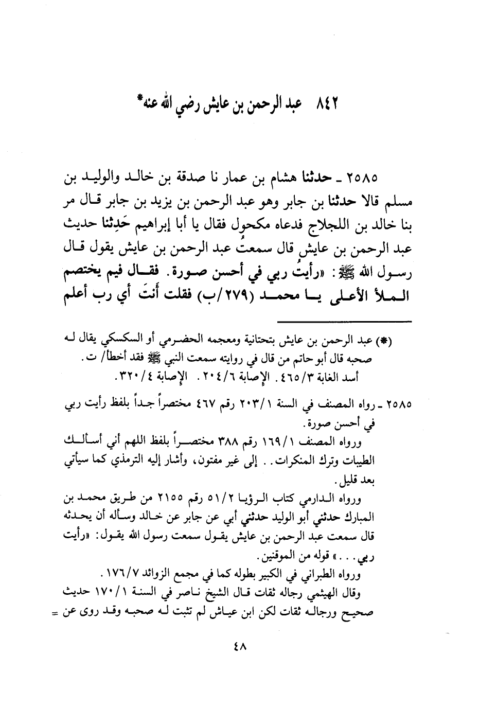 2585 - حَدَّثَنَا هِشَامُ بْنُ عَمَّارٍ، نا صَدَقَةُ بْنُ خَالِدٍ، وَالْوَلِيدُ بْنُ مُسْلِمٍ قَالَا: حَدَّثَنَا ابْنُ جَابِرٍ، وَهُوَ عَبْدُ الرَّحْمَنِ بْنُ يَزِيدَ بْنِ جَابِرٍ قَالَ: مَرَّ بِنَا خَالِدُ بْنُ اللَّجْلَاجِ فَدَعَاهُ مَكْحُولٌ فَقَالَ: يَا أَبَا إِبْرَاهِيمَ حَدِّثْنَا حَدِيثَ عَبْدِ الرَّحْمَنِ بْنِ عَايِشٍ قَالَ: سَمِعْتُ عَبْدَ الرَّحْمَنِ بْنَ عَايِشٍ يَقُولُ: قَالَ رَسُولُ اللَّهِ صَلَّى اللهُ عَلَيْهِ وَسَلَّمَ: " §رَأَيْتُ رَبِّي فِي أَحْسَنِ صُورَةٍ فَقَالَ: فِيمَ يَخْتَصِمُ الْمَلَأُ الْأَعْلَى يَا مُحَمَّدُ؟ فَقُلْتُ: أَنْتَ أَيْ رَبِّ أَعْلَمُ -[49]-. فَوَضَعَ كَفَّهُ بَيْنَ كَتِفِي فَوَجَدْتُ بَرْدَهَا بَيْنَ ثَدْيَيَّ فَعَلِمْتُ مَا فِي السَّمَاوَاتِ وَمَا فِي الْأَرْضِ ثُمَّ تَلَا {وَكَذَلِكَ نُرِي إِبْرَاهِيمَ مَلَكُوتَ السَّمَاوَاتِ وَالْأَرْضِ وَلِيَكُونَ مِنَ الْمُوقِنِينَ} [الأنعام: 75] فَسَأَلَهُمْ فِيمَ يَخْتَصِمُ الْمَلَأُ الْأَعْلَى يَا مُحَمَّدُ؟ فَقُلْتُ: فِي الْكَفَّارَاتِ. قَالَ: وَمَا هُنَّ؟ قُلْتُ: الْمَشْيُ عَلَى الْأَقْدَامِ إِلَى الْجُمُعَاتِ وَالْجُلُوسُ فِي الْمَسَاجِدِ خِلَافَ الصَّلَوَاتِ، وَإِبْلَاغُ الْوَضُوءِ أَمَاكِنَهُ فِي الْمَكَارِهِ. قَالَ: قَالَ اللَّهُ عَزَّ وَجَلَّ: مَنْ يَفْعَلْ ذَلِكَ يَعِشْ بِخَيْرٍ وَيَمُتْ بِخَيْرٍ يَكُونُ مِنْ خَطِيئتِهِ كَيَوْمِ وَلَدَتْهُ أُمُّهُ، وَمِنَ الدَّرَجَاتِ إِطْعَامُ الطَّعَامِ وَبَذْلُ السَّلَامِ وَأَنْ تَقْرَأَ بِاللَّيْلِ وَالنَّاسُ نِيَامٌ: قُلِ اللَّهُمَّ إِنِّي أَسْأَلُكَ الطَّيِّبَاتِ وَتَرْكَ الْمُنْكَرَاتِ وَحُبَّ الْمَسَاكِينِ، وَأَنْ تَغْفِرَ لِي وَتَرْحَمَنِي وَتَتُوبَ عَلَيَّ وَإِذَا أَرَدْتَ فِتْنَةً فِي قَوْمٍ فَتَوفَّنِي غَيْرَ مَفْتُونٍ ". فَقَالَ رَسُولُ اللَّهِ صَلَّى اللهُ عَلَيْهِ وَسَلَّمَ: «تَعَلَّمُوهُنَّ فَوَالَّذِي نَفْسِي بِيَدِهِ إِنَّهُنَّ لَحَقٌّ»