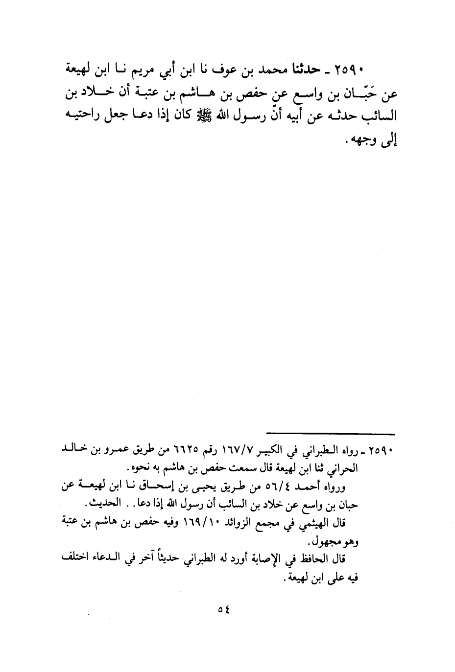 2590 - حَدَّثَنَا مُحَمَّدُ بْنُ عَوْفٍ، نا ابْنُ أَبِي مَرْيَمَ، نا ابْنُ لَهِيعَةَ، عَنْ حَبَّانَ بْنِ وَاسِعٍ، عَنْ حَفْصِ بْنِ هَاشِمِ بْنِ عُتْبَةَ، أَنَّ خَلَّادَ بْنَ السَّائِبِ، حَدَّثَهُ عَنْ أَبِيهِ، أَنَّ رَسُولَ اللَّهِ صَلَّى اللهُ عَلَيْهِ وَسَلَّمَ كَانَ §إِذَا دَعَا جَعَلَ رَاحَتَيْهِ إِلَى وَجْهِهِ