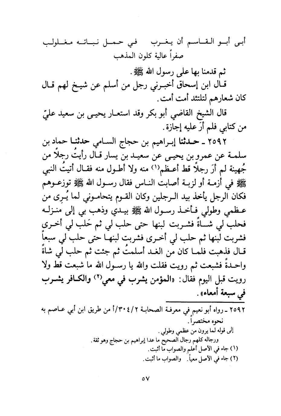 2592 - حَدَّثَنَا إِبْرَاهِيمُ بْنُ حَجَّاجٍ السَّامِيُّ، حَدَّثَنَا حَمَّادُ بْنُ سَلَمَةَ، عَنْ عَمْرِو بْنِ يَحْيَى، عَنْ سَعِيدِ بْنِ يَسَارٍ قَالَ: رَأَيْتُ رَجُلًا مِنْ جُهَيْنَةَ لَمْ أَرَ رَجُلًا قَطُّ أَعْظَمَ مِنْهُ وَلَا أَطْوَلَ مِنْهُ، فَقَالَ: أَتَيْتُ النَّبِيَّ صَلَّى اللهُ عَلَيْهِ وَسَلَّمَ فِي أَزْمَةٍ أَوْ لَزْبَةٍ أَصَابَتِ النَّاسَ فَقَالَ رَسُولُ اللَّهِ صَلَّى اللهُ عَلَيْهِ وَسَلَّمَ: «تَوَزَّعُوهُمْ» . فَكَانَ الرَّجُلُ يَأْخُذُ بِيَدِ الرِّجْلَيْنِ وَكَانَ الْقَوْمُ يَتَحَامُونِي لِمَا يُرَى مِنْ عِظَمِي وَطُولِي فَأَخَذَ رَسُولُ اللَّهِ صَلَّى اللهُ عَلَيْهِ وَسَلَّمَ بِيَدِي وَذَهَبَ بِي إِلَى مَنْزِلِهِ فَحَلَبَ لِي شَاةً فَشَرِبْتُ لَبَنَهَا حَتَّى حَلَبَ لِي ثُمَّ حَلَبَ لِي أُخْرَى فَشَرِبْتُ لَبَنَهَا ثُمَّ حَلَبَ لِي أُخْرَى فَشَرِبْتُ لَبَنَهَا حَتَّى حَلَبَ لِي سَبْعًا قَالَ: فَذَهَبْتُ، فَلَمَّا كَانَ مِنَ الْغَدِ أَسْلَمْتُ ثُمَّ جِئْتُ ثُمَّ حَلَبَ لِي شَاةً وَاحِدَةً فَشَبِعْتُ ثُمَّ رَوِيتُ فَقُلْتُ: وَاللَّهِ يَا رَسُولَ اللَّهِ، مَا شَبِعْتُ قَطُّ، وَلَا رَوِيتُ قَبْلَ الْيَوْمِ. فَقَالَ: " §الْمُؤْمِنُ يَشْرَبُ فِي مَعِيٍّ وَالْكَافِرُ يَشْرَبُ فِي سَبْعَةِ أَمْعَاءَ
