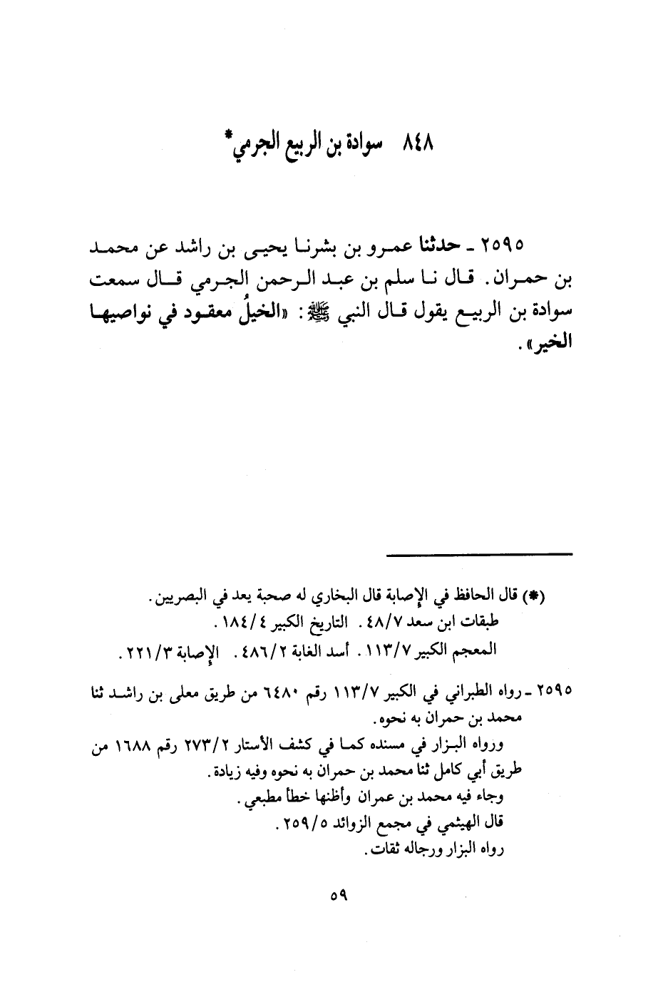 2595 - حَدَّثَنَا عَمْرُو بْنُ بِشْرٍ، نا يَحْيَى بْنُ رَاشِدٍ، عَنْ مُحَمَّدِ بْنِ حُمْرَانَ قَالَ: نا سَلْمُ بْنُ عَبْدِ الرَّحْمَنِ الْجَرْمِيُّ قَالَ: سَمِعْتُ سَوَادَةَ بْنَ الرَّبِيعِ يَقُولُ: قَالَ النَّبِيُّ صَلَّى اللهُ عَلَيْهِ وَسَلَّمَ: «§الْخَيْلُ مَعْقُودٌ فِي نَوَاصِيهَا الْخَيْرُ»