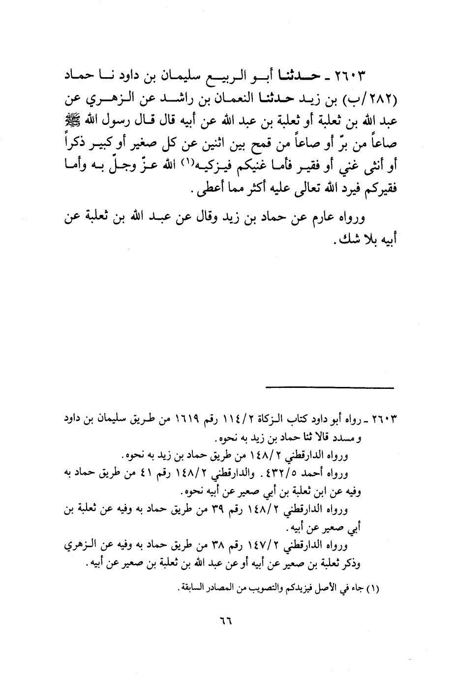 2603 - حَدَّثَنَا أَبُو الرَّبِيعِ سُلَيْمَانُ بْنُ دَاوُدَ، نا حَمَّادُ بْنُ زَيْدٍ، حَدَّثَنَا النُّعْمَانُ بْنُ رَاشِدٍ، عَنِ الزُّهْرِيِّ، عَنْ عَبْدِ اللَّهِ بْنِ ثَعْلَبَةَ، أَوْ ثَعْلَبَةَ بْنِ عَبْدِ اللَّهِ، عَنْ أَبِيهِ قَالَ: قَالَ رَسُولُ اللَّهِ صَلَّى اللهُ عَلَيْهِ وَسَلَّمَ: «§صَاعًا مِنْ بُرٍّ أَوْ صَاعًا مِنْ قَمْحٍ بَيْنَ اثْنَيْنِ عَنْ كُلِّ صَغِيرٍ أَوْ كَبِيرٍ ذِكْرًا أَوْ أُنْثَى غَنِيٍّ أَوْ فَقِيرٍ فَأَمَّا غَنِيُّكُمْ فَيُزَكِّيهِ اللَّهُ عَزَّ وَجَلَّ بِهِ وَأَمَّا فَقِيرُكُمْ فَيَرُدُّ اللَّهُ تَعَالَى عَلَيْهِ أَكْثَرَ مِمَّا أَعْطَى» وَرَوَاهُ عَارِمٌ، عَنْ حَمَّادِ بْنِ زَيْدٍ، وَقَالَ: عَنْ عَبْدِ اللَّهِ بْنِ ثَعْلَبَةَ، عَنْ أَبِيهِ بِلَا شَكَّ