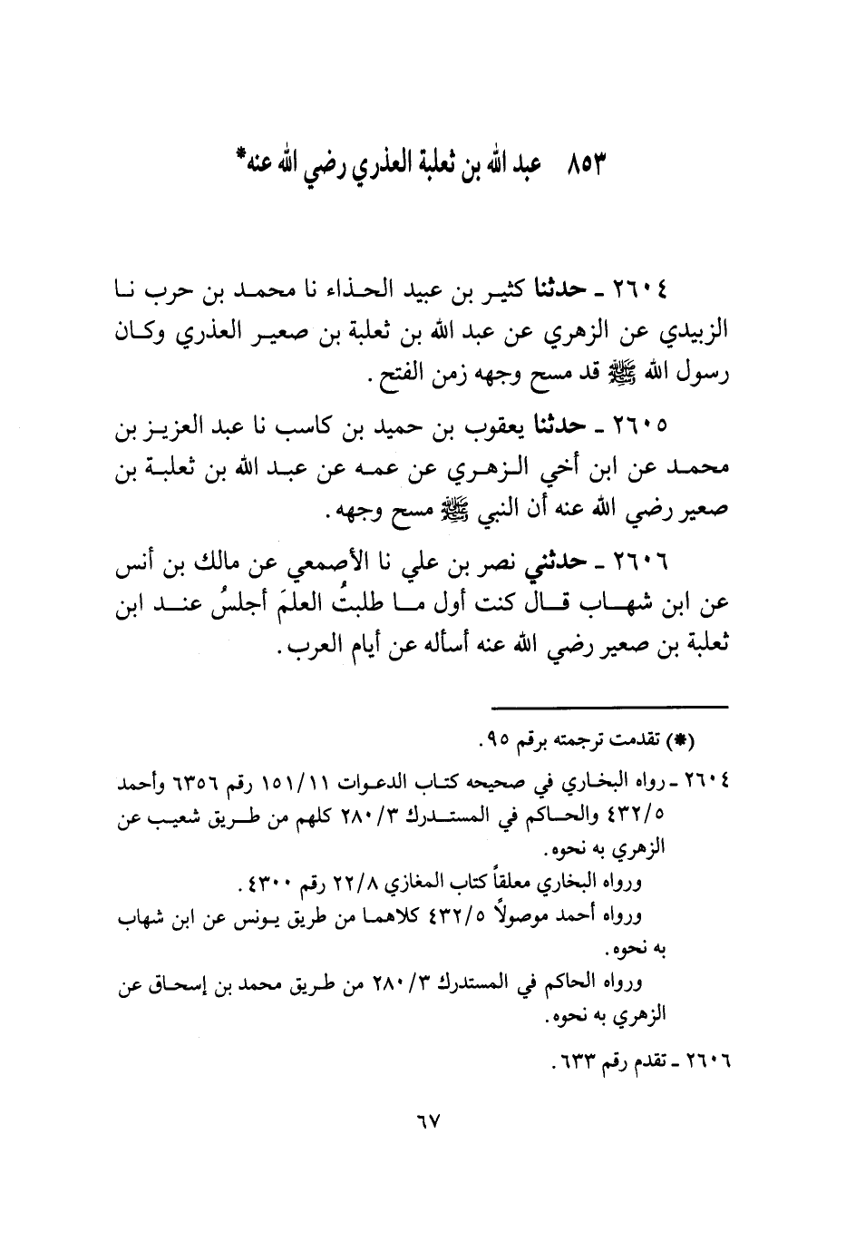 2604 - حَدَّثَنَا كَثِيرُ بْنُ عُبَيْدٍ الْحَذَّاءُ، نا مُحَمَّدُ بْنُ حَرْبٍ، نا الزُّبَيْدِيُّ، عَنِ الزُّهْرِيِّ، عَنْ عَبْدِ اللَّهِ بْنِ ثَعْلَبَةَ بْنِ صُعَيْرٍ الْعُذْرِيِّ، وَكَانَ رَسُولُ اللَّهِ صَلَّى اللهُ عَلَيْهِ وَسَلَّمَ قَدْ §مَسَحَ وَجْهَهُ زَمَنَ الْفَتْحِ