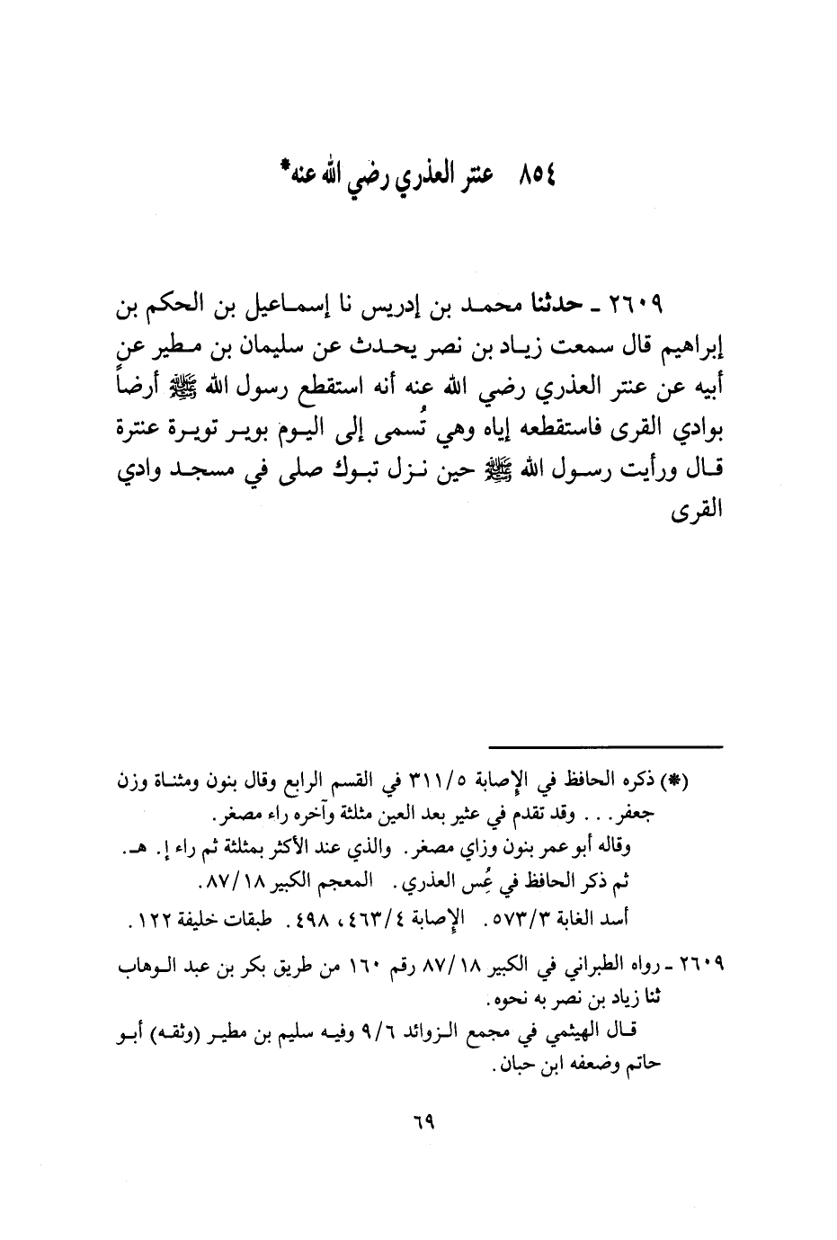 2609 - حَدَّثَنَا مُحَمَّدُ بْنُ إِدْرِيسَ، نا إِسْمَاعِيلُ بْنُ الْحَكَمِ بْنِ إِبْرَاهِيمَ قَالَ: سَمِعْتُ زِيَادَ بْنَ نَصْرٍ، يُحَدِّثُ، عَنْ سُلَيْمَانَ بْنِ مَطِيرٍ، عَنْ أَبِيهِ، عَنْ عَنْتَرٍ الْعُذْرِيِّ رَضِيَ اللَّهُ عَنْهُ أَنَّهُ اسْتَقْطَعَ رَسُولُ اللَّهِ صَلَّى اللهُ عَلَيْهِ وَسَلَّمَ أَرْضًا بِوَادِي الْقُرَى §فَاسْتَقْطَعَهُ إِيَّاهُ وَهِيَ تُسَمَّى إِلَى الْيَوْمِ بِوَيْرَ تُوَيْرَةِ عَنْتَرَةَ قَالَ: وَرَأَيْتُ رَسُولَ اللَّهِ صَلَّى اللهُ عَلَيْهِ وَسَلَّمَ حِينَ نَزَلَ تَبُوكَ صَلَّى فِي مَسْجِدِ وَادِي الْقُرَى