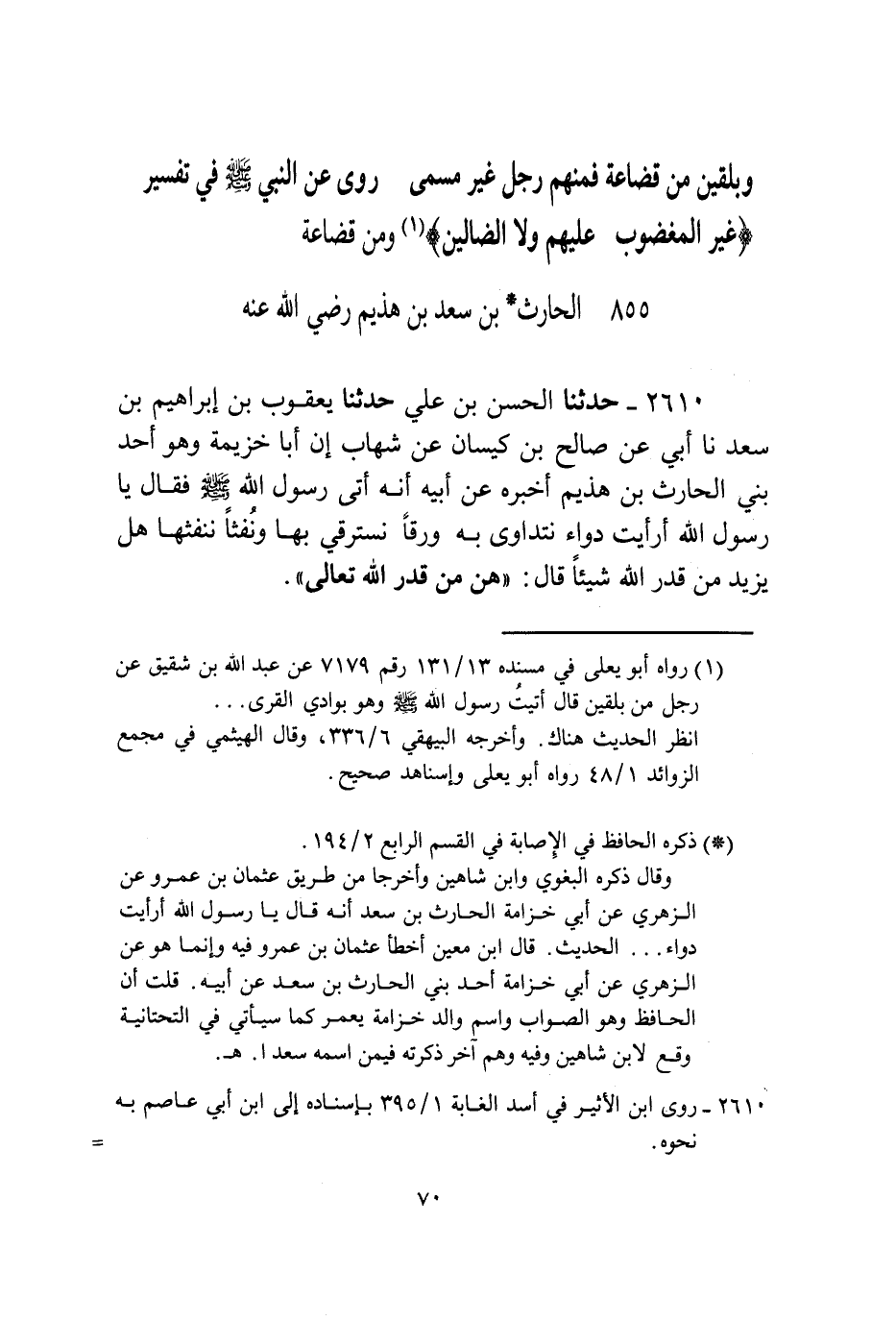2610 - حَدَّثَنَا الْحَسَنُ بْنُ عَلِيٍّ، حَدَّثَنَا يَعْقُوبُ بْنُ إِبْرَاهِيمَ بْنِ سَعْدٍ، نا أَبِي، عَنْ صَالِحِ بْنِ كَيْسَانَ، عَنِ ابْنِ شِهَابٍ، أَنَّ ابْنَ أَبِي خَزَّامَةَ، وَهُوَ أَحَدُ بَنِي الْحَارِثِ بْنِ هُذَيْمٍ أَخْبَرَهُ، عَنْ أَبِيهِ، أَنَّهُ أَتَى رَسُولَ اللَّهِ صَلَّى اللهُ عَلَيْهِ وَسَلَّمَ فَقَالَ: يَا رَسُولَ اللَّهِ، §أَرَأَيْتَ دَوَاءً نَتَدَاوَى بِهِ وَرُقًى نَسْتَرْقِي بِهَا وَنَفَثًا نَنْفُثُهُا هَلْ يَزِيدُ مِنْ قَدَرِ اللَّهِ شَيْئًا؟ قَالَ: «هُنَّ مِنْ قَدَرِ اللَّهِ تَعَالَى»