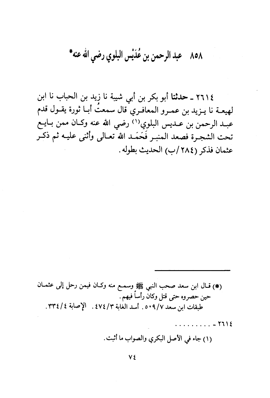 2614 - حَدَّثَنَا أَبُو بَكْرِ بْنُ أَبِي شَيْبَةَ، نَا زَيْدُ بْنُ الْحُبَابِ، نَا ابْنُ لَهِيعَةَ، نَا يَزِيدُ بْنُ عَمْرٍو الْمَعَافِرِيُّ قَالَ: سَمِعْتُ أَبَا ثَوْرَةَ يَقُولُ: قَدِمَ عَبْدُ الرَّحْمَنِ بْنُ عُدَيْسٍ الْبَلَوِيُّ رَضِيَ اللَّهُ عَنْهُ وَكَانَ مِمَّنْ بَايَعَ تَحْتَ الشَّجَرَةِ فَصَعِدَ الْمِنْبَرَ فَحَمِدَ اللَّهَ تَعَالَى وَأَثْنَى عَلَيْهِ ثُمَّ ذَكَرَ عُثْمَانَ فَذَكَرَ الْحَدِيثَ بِطُولِهِ