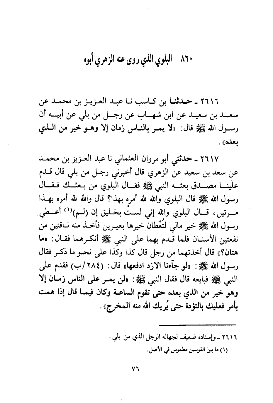 2617 - حَدَّثَنِي أَبُو مَرْوَانَ الْعُثْمَانِيُّ، نا عَبْدُ الْعَزِيزِ بْنُ مُحَمَّدٍ، عَنْ سَعْدِ بْنِ سَعِيدٍ، عَنِ الزُّهْرِيِّ قَالَ: أَخْبَرَنِي رَجُلٌ مِنْ بَلِيٍّ قَالَ: قَدِمَ عَلَيْنَا مُصَدَّقٌ بَعَثَهُ النَّبِيُّ صَلَّى اللهُ عَلَيْهِ وَسَلَّمَ فَقَالَ الْبَلَوِيُّ مَنْ بَعَثَكَ؟ فَقَالَ: رَسُولُ اللَّهِ صَلَّى اللهُ عَلَيْهِ وَسَلَّمَ. قَالَ الْبَلَوِيُّ: وَاللَّهِ للَّهُ أَمَرَهُ بِهَذَا؟ قَالَ: وَاللَّهِ لَلَّهُ أَمَرَهُ بِهَذَا مَرَّتَيْنِ. قَالَ الْبَلَوِيُّ: وَاللَّهِ إِنِّي لَسْتُ بِخَلِيقٍ إِنْ لَمْ أُعْطِ رَسُولَ اللَّهِ صَلَّى اللهُ عَلَيْهِ وَسَلَّمَ خَيْرَ مَالِي لَتُعْطَانَّ خَيْرَهَا بَعِيرَيْنِ فَأَخَذَ مِنْهُ نَاقَتَيْنِ مِنْ نَفِعَتَيْنِ الْأَسْنَانِ فَلَمَّا قَدِمَ بِهِمَا عَلَى النَّبِيِّ صَلَّى اللهُ عَلَيْهِ وَسَلَّمَ أَنْكَرَهُمَا فَقَالَ: مَا هَتَانِ قَالَ: أَخَذْتُهُمَا مِنْ رَجُلٍ قَالَ: كَذَا وَكَذَا عَلَى نَحْوِ مَا ذَكَرَ فَقَالَ رَسُولُ اللَّهِ صَلَّى اللهُ عَلَيْهِ وَسَلَّمَ: «لَوْ جَاءَنَا الْأَزْدُ أَدْفَعُهَا» قَالَ: فَقَدِمَ عَلَى النَّبِيِّ صَلَّى اللهُ عَلَيْهِ وَسَلَّمَ فَبَايَعَهُ قَالَ: فَقَالَ النَّبِيُّ صَلَّى اللهُ عَلَيْهِ وَسَلَّمَ: «§لَنْ يَمُرَّ عَلَى النَّاسِ زَمَانٌ إِلَّا وَهُوَ خَيْرٌ مِنَ الَّذِي بَعْدَهُ حَتَّى تَقُومَ السَّاعَةُ» وَكَانَ فِيمَا قَالَ: «إِذَا هَمَمْتَ بِأَمْرٍ فَعَلَيْكَ بِالتُّؤَدَةِ حَتَّى يُرِيَكَ اللَّهُ مِنْهُ الْمَخْرَجَ»