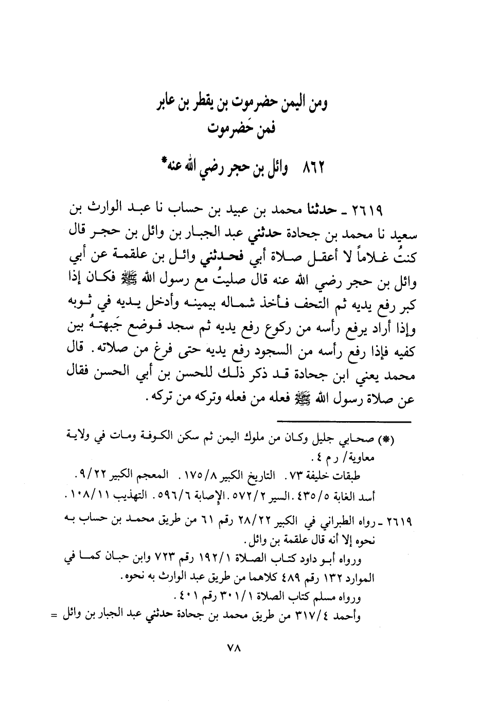 2619 - حَدَّثَنَا مُحَمَّدُ بْنُ عُبَيْدِ بْنِ حِسَابٍ، نا عَبْدُ الْوَارِثِ بْنِ سَعِيدٍ، نا مُحَمَّدُ بْنُ جُحَادَةَ، حَدَّثَنِي عَبْدُ الْجَبَّارِ بْنُ وَائِلِ بْنِ حُجْرٍ قَالَ: كُنْتُ غُلَامًا لَا أَعْقِلُ صَلَاةَ أَبِي فَحَدَّثَنِي وَائِلُ بْنُ عَلْقَمَةَ عَنْ أَبِي وَائِلِ بْنِ حُجْرٍ رَضِيَ اللَّهُ عَنْهُ قَالَ: صَلَّيْتُ مَعَ رَسُولِ اللَّهِ صَلَّى اللهُ عَلَيْهِ وَسَلَّمَ فَكَانَ §إِذَا كَبَّرَ رَفَعَ يَدَيْهِ ثُمَّ الْتَحَفَ فَأَخَذَ شِمَالَهُ بِيَمِينِهِ وَأَدْخَلَ يَدَيْهِ فِي ثَوْبِهِ وَإِذَا أَرَادَ يَرْفَعُ رَأْسَهُ مِنْ رُكُوعٍ رَفَعَ يَدَيْهِ ثُمَّ سَجَدَ فَوَضَعَ جَبْهَتَهُ بَيْنَ كَفَّيْهِ فَإِذَا رَفَعَ رَأْسَهُ مِنَ السُّجُودِ رَفَعَ يَدَيْهِ حَتَّى فَرَغَ مِنْ صَلَاتِهِ قَالَ مُحَمَّدٌ يَعْنِي: ابْنَ جُحَادَةَ قَدْ ذُكِرَ ذَلِكَ لِلْحَسَنِ بْنِ أَبِي الْحَسَنِ فَقَالَ عَنْ صَلَاةِ رَسُولِ اللَّهِ صَلَّى اللهُ عَلَيْهِ وَسَلَّمَ فَعَلَهُ مَنْ فَعَلَهُ وَتَرَكَهُ مَنْ تَرَكَهُ. قَالَ أَبُو بَكْرِ بْنُ أَبِي عَاصِمٍ: وَلِوَائِلِ بْنِ حُجْرٍ طُرُقٌ كَثِيرَةٌ فِيهَا حَتَّى النَّبِيِّ صَلَّى اللهُ عَلَيْهِ وَسَلَّمَ