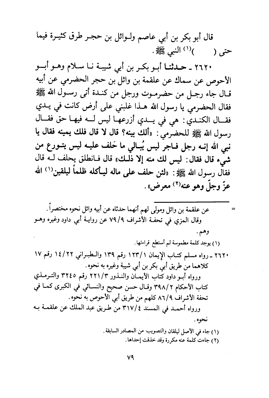 2620 - حَدَّثَنَا أَبُو بَكْرِ بْنُ أَبِي شَيْبَةَ، نا سَلَّامٌ، وَهُوَ أَبُو الْأَحْوَصِ، عَنْ سِمَاكٍ، عَنْ عَلْقَمَةَ بْنِ وَائِلِ بْنِ حُجْرٍ الْحَضْرَمِيِّ، عَنْ أَبِيهِ قَالَ: جَاءَ رَجُلٌ مِنْ حَضْرَمَوْتَ وَرَجُلٌ مِنْ كِنْدَةَ أَتَى رَسُولَ اللَّهِ صَلَّى اللهُ عَلَيْهِ وَسَلَّمَ فَقَالَ الْحَضْرَمِيُّ: يَا رَسُولَ اللَّهِ، هَذَا غَلَبَنِي عَلَى أَرْضٍ كَانَتْ فِي يَدِي. فَقَالَ الْكِنْدِيُّ: هِيَ فِي يَدِي أَزْرَعُهَا لَيْسَ لَهُ فِيهَا حَقٌّ. فَقَالَ رَسُولُ اللَّهِ صَلَّى اللهُ عَلَيْهِ وَسَلَّمَ لِلْحَضْرَمِيِّ: «أَلَكَ بَيِّنَةٌ؟» قَالَ: لَا. قَالَ: «فَلَكَ يَمِينُهُ» فَقَالَ: يَا نَبِيَّ اللَّهِ إِنَّهُ رَجُلٌ فَاجِرٌ لَيْسَ يُبَالِي مَا حَلَفَ عَلَيْهِ لَيْسَ يَتَوَرَّعُ مِنْ شَيْءٍ. قَالَ: فَقَالَ: لَيْسَ لَكَ مِنْهُ إِلَّا ذَلِكَ " قَالَ: فَانْطَلَقَ يَحْلِفُ لَهُ. قَالَ: فَقَالَ رَسُولُ اللَّهِ صَلَّى اللهُ عَلَيْهِ وَسَلَّمَ: §لَئِنْ حَلَفَ عَلَى مَالِهِ لِيَأْكُلَهُ ظُلْمًا لَيَلْقَيَنَّ اللَّهَ عَزَّ وَجَلَّ وَهُوَ عَنْهُ مُعْرِضٌ "