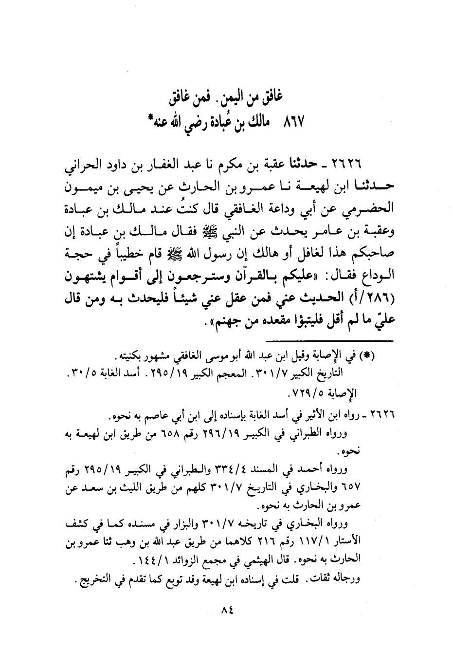2626 - حَدَّثَنَا عُقْبَةُ بْنُ مُكْرَمٍ، نا عَبْدُ الْغَفَّارِ بْنِ دَاوُدَ الْحَرَّانِيُّ، حَدَّثَنَا ابْنُ لَهِيعَةَ، نا عَمْرُو بْنُ الْحَارِثِ، عَنْ يَحْيَى بْنِ مَيْمُونٍ الْحَضْرَمِيِّ، عَنْ أَبِي وَدَاعَةَ الْغَافِقِيِّ قَالَ: كُنْتُ عِنْدَ مَالِكِ بْنِ عُبَادَةَ وَعُقْبَةُ بْنُ عَامِرٍ يُحَدِّثُ عَنِ النَّبِيِّ صَلَّى اللهُ عَلَيْهِ وَسَلَّمَ فَقَالَ مَالِكُ بْنُ عُبَادَةَ: إِنَّ صَاحِبَكُمْ هَذَا لَغَافِلٌ أَوْ هَالِكٌ، إِنَّ رَسُولَ اللَّهِ صَلَّى اللهُ عَلَيْهِ وَسَلَّمَ قَامَ خَطِيبًا فِي حَجَّةِ الْوَدَاعِ فَقَالَ: «§عَلَيْكُمْ بِالْقُرْآنِ وَسَتَرْجِعُونَ إِلَى أَقْوَامٍ يَشْتَهُونَ الْحَدِيثَ عَنِّي فَمَنْ عَقَلَ عَنِّي شَيْئًا فَلْيُحَدِّثْ بِهِ، وَمَنْ قَالَ عَلَيَّ مَا لَمْ أَقُلْ فَلْيَتَبَوَّأْ مَقْعَدَهُ مِنْ جَهَنَّمَ»