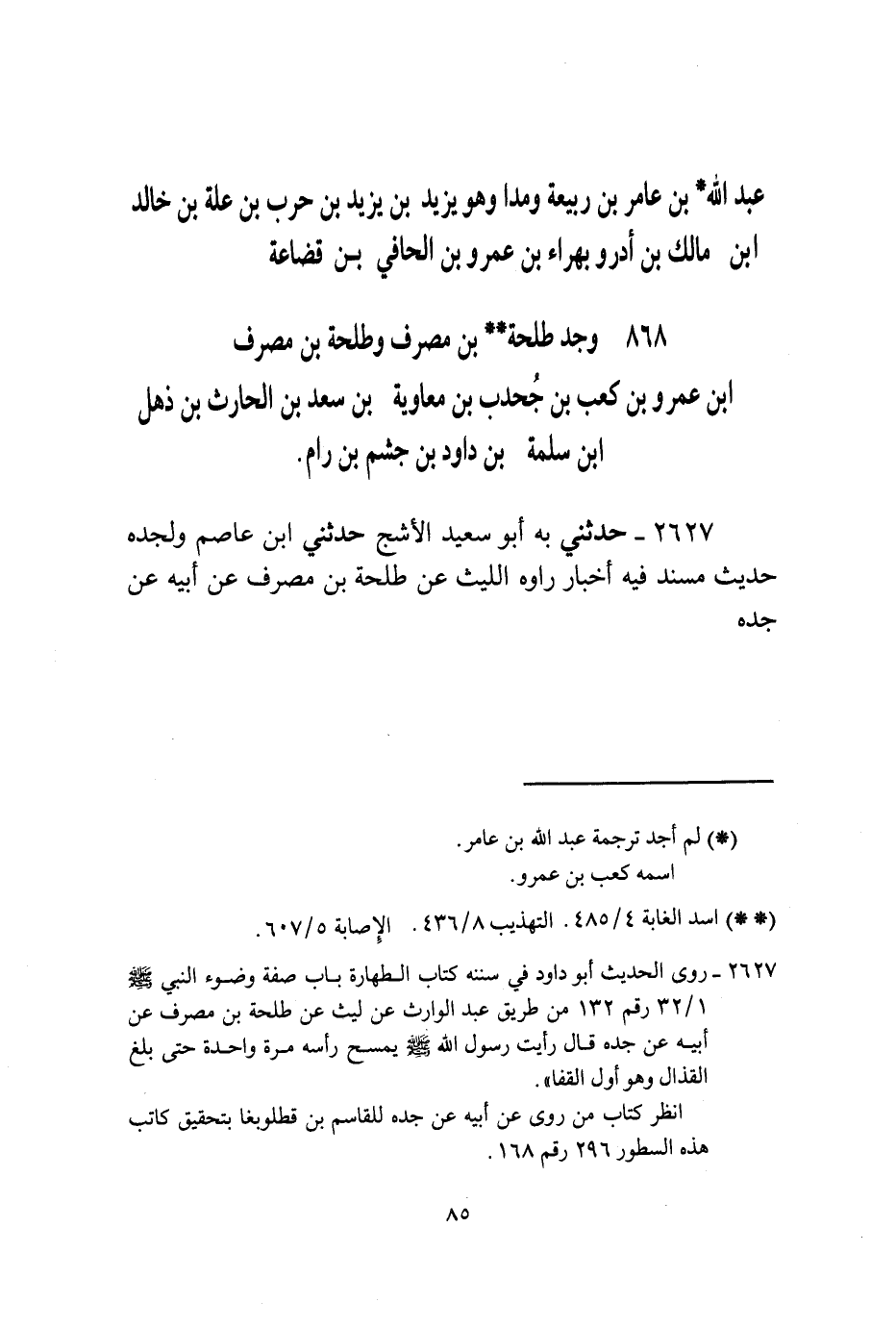 §عَبْدُ اللَّهِ بْنُ عَامِرِ بْنِ رَبِيعَةَ، وَهُوَ يَزِيدُ بْنُ يَزِيدَ بْنِ حَرْبِ بْنِ عِلَّةَ بْنِ خَالِدِ بْنِ مَالِكِ بْنِ أَدْرِ وَبَهْرَاءُ بْنُ عَمْرِو بْنِ الْحَافِي بْنِ قُضَاعَةَ وَجَدُّ طَلْحَةَ بْنِ مُصَرِّفٍ وَطَلْحَةُ بْنُ مُصَرِّفِ بْنِ عَمْرِو بْنِ كَعْبِ بْنِ جُحْدُبِ بْنِ مُعَاوِيَةَ بْنِ سَعْدِ بْنِ الْحَارِثِ بْنِ ذُهْلِ بْنِ سَلَمَةَ بْنِ دَاوُدَ بْنِ جُشَمِ بْنِ رَامٍ