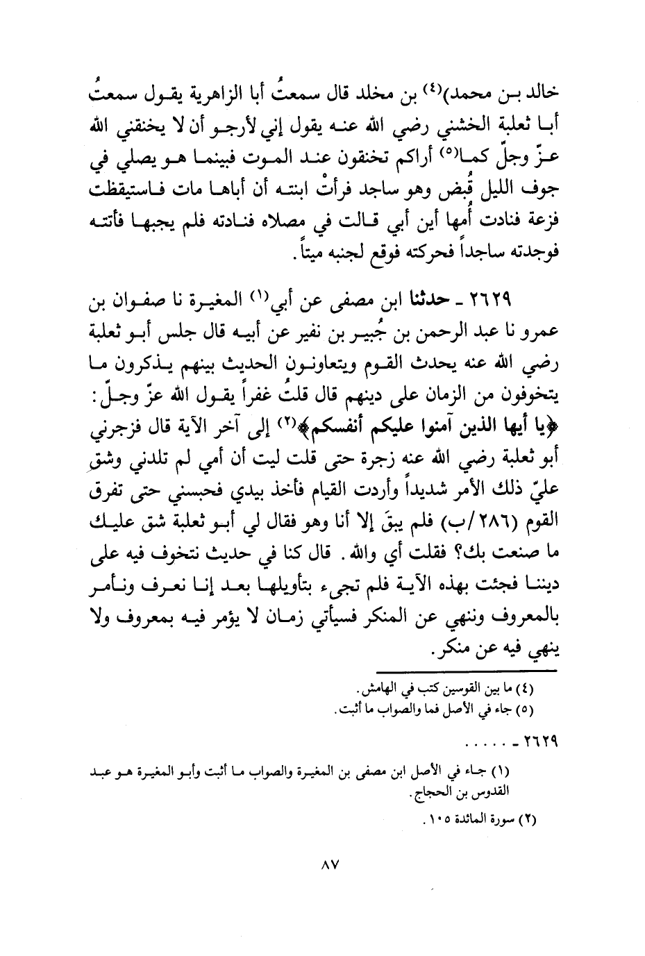 2629 - حَدَّثَنَا ابْنُ مُصَفَّى، عَنْ أَبِي الْمُغِيرَةِ، نا صَفْوَانُ بْنُ عَمْرٍو، نا عَبْدُ الرَّحْمَنِ بْنُ جُبَيْرِ بْنِ نُفَيْرٍ، عَنْ أَبِيهِ قَالَ: " §جَلَسَ أَبُو ثَعْلَبَةَ رَضِيَ اللَّهُ عَنْهُ يُحَدِّثُ الْقَوْمَ وَيَتَعَاوَنُونَ الْحَدِيثَ بَيْنَهُمْ يَذْكُرُونَ مَا يَتَخَوَّفُونَ مِنَ الزَّمَانِ عَلَى دِينِهِمْ قَالَ: قُلْتُ: غُفْرًا يَقُولُ اللَّهُ عَزَّ وَجَلَّ: {يَا أَيُّهَا الَّذَيْنِ آمَنُوا عَلَيْكُمْ أَنْفُسَكُمْ} [المائدة: 105] إِلَى آخِرِ الْآيَةِ. قَالَ: فَزَجَرَنِي أَبُو ثَعْلَبَةَ رَضِيَ اللَّهُ عَنْهُ زَجْرَةً حَتَّى قُلْتُ: لَيْتَ أَنَّ أُمِّي لَمْ تَلِدْنِي وَشَقَّ عَلَيَّ ذَلِكَ الْأَمْرُ شَدِيدًا وَأَرَدْتُ الْقِيَامَ فَأَخَذَ بِيَدِي فَحَبَسَنِي حَتَّى تَفَرَّقَ الْقَوْمُ فَلَمْ يَبْقَ إِلَّا أَنَا وَهُوَ فَقَالَ لِي أَبُو ثَعْلَبَةَ: شَقَّ عَلَيْكَ مَا صَنَعْتُ بِكَ؟ فَقُلْتُ: إِي وَاللَّهِ. قَالَ: كُنَّا فِي حَدِيثٍ نَتَخَوَّفُ فِيهِ عَلَى دِينِنَا فَجِئْتَ بِهَذِهِ الْآيَةِ فَلَمْ تَجِئْ بِتَأْوِيلِهَا بَعْدُ، إِنَّا نَعْرِفُ وَنَأْمُرُ بِالْمَعْرُوفِ وَنَنْهَى عَنِ الْمُنْكَرِ فَسَيَأْتِي زَمَانٌ لَا يُؤْمَرُ فِيهِ بِمَعْرُوفٍ وَلَا يُنْهَى فِيهِ عَنْ مُنْكَرٍ قَالَ أَبُو بَكْرٍ: وَلِأَبِي ثَعْلَبَةَ فِي كِتَابِ أَخْبَارِ الشَّامِ وَفِي كِتَابِ أَصْحَابِ النَّبِيِّ صَلَّى اللهُ عَلَيْهِ وَسَلَّمَ أَحَادِيثُ كَثِيرَةٌ وَأَخْبَارٌ، وَمِمَّا أَسْنَدَ