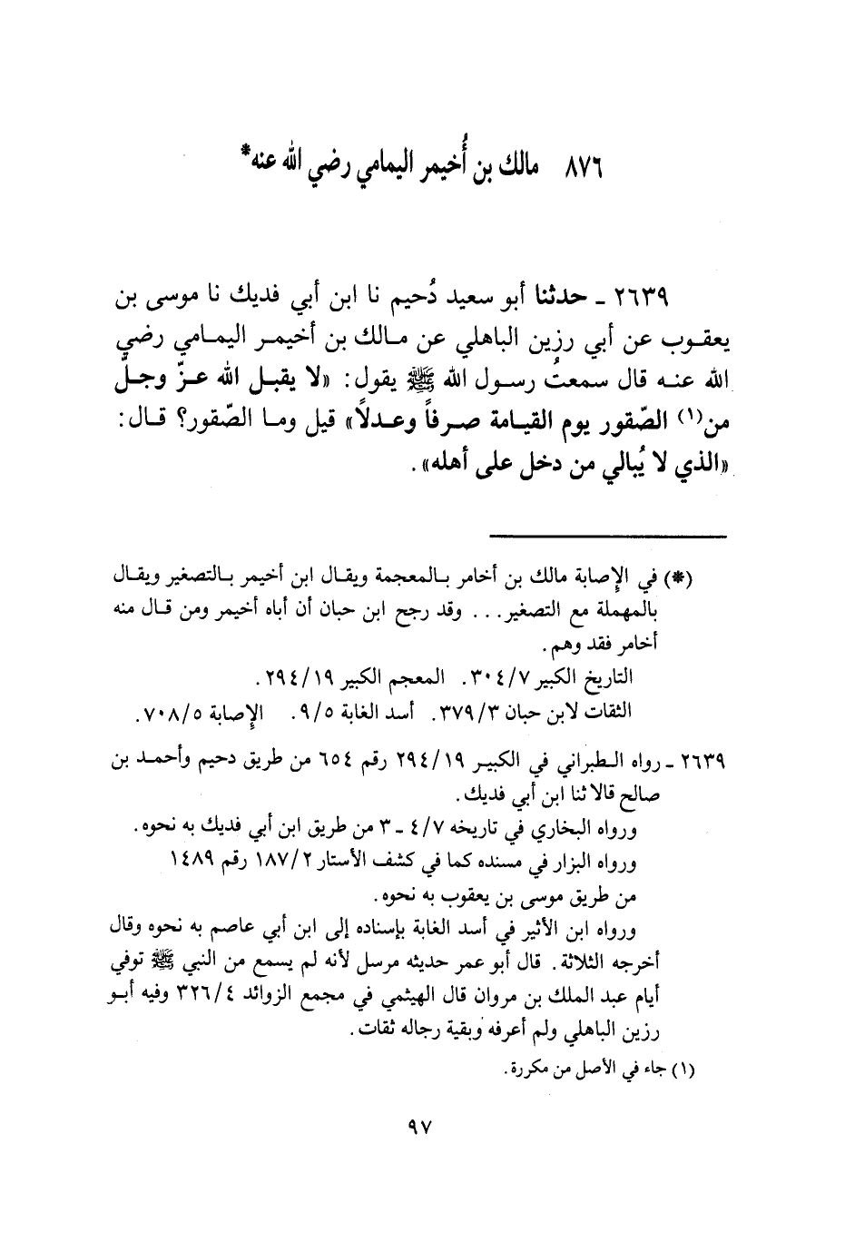 2639 - حَدَّثَنَا أَبُو سَعِيدٍ دُحَيْمٌ، نا ابْنُ أَبِي فُدَيْكٍ، نا مُوسَى بْنُ يَعْقُوبَ، عَنْ أَبِي رَزِينٍ الْبَاهِلِيِّ، عَنْ مَالِكِ بْنِ أُخَيْمِرَ الْيَمَامِيِّ، رَضِيَ اللَّهُ عَنْهُ قَالَ: سَمِعْتُ رَسُولَ اللَّهِ صَلَّى اللهُ عَلَيْهِ وَسَلَّمَ يَقُولُ: «§لَا يَقْبَلُ اللَّهُ عَزَّ وَجَلَّ مِنَ الصَّقُورِ يَوْمَ الْقِيَامَةِ صَرْفًا وَعَدْلًا» قِيلَ: وَمَا الصَّقُورُ؟ قَالَ: «الَّذِي لَا يُبَالِي مَنْ دَخَلَ عَلَى أَهْلِهِ»