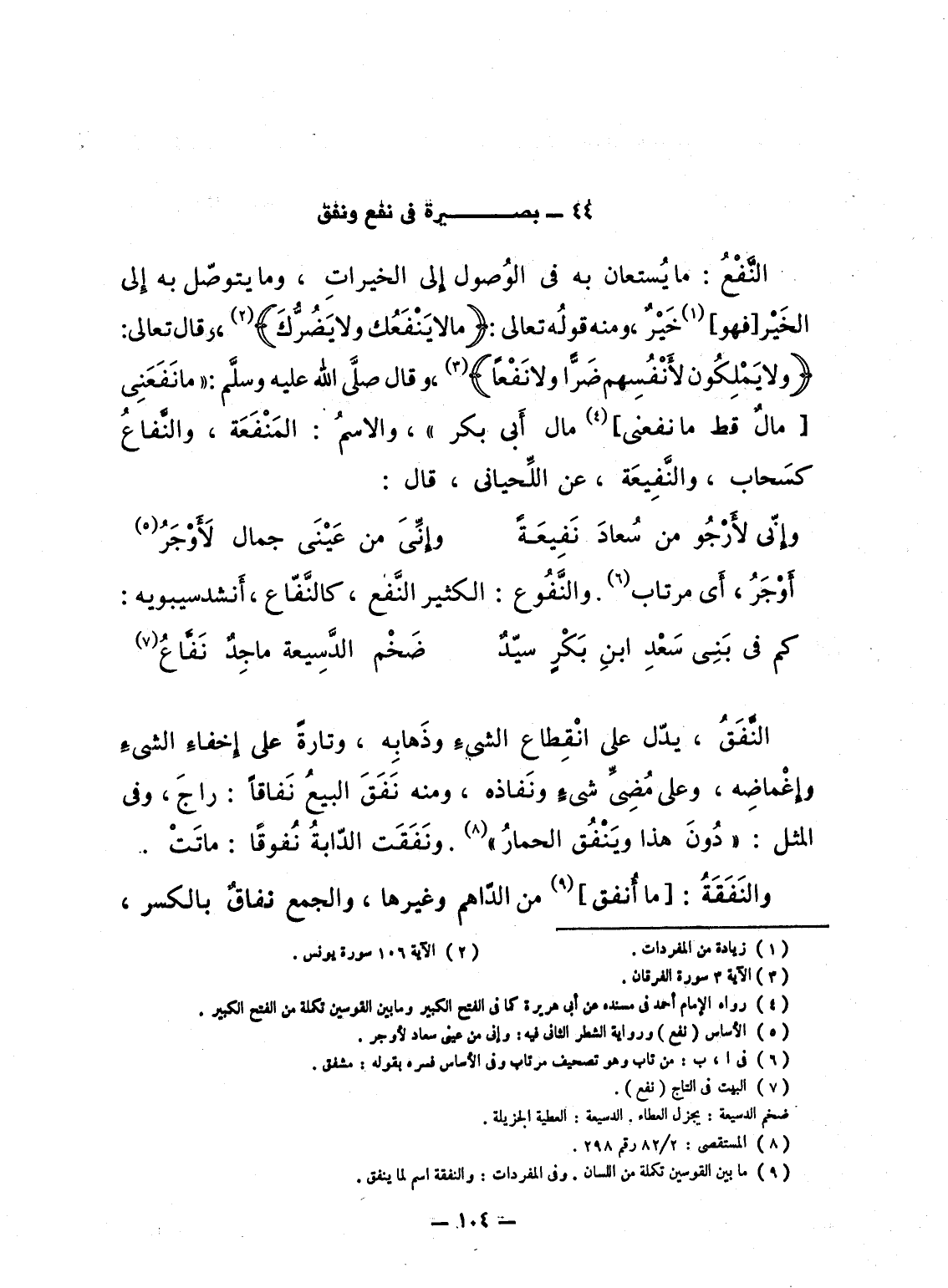 النَفْعُ: ما يُستعان به فى الوُصول إلى الخيرات، وما يتوصّل به إِلى الخَيْر [فهو] خَيْرٌ، ومنه قولُه تعالى: {مَا لاَ يَنفَعُكَ وَلاَ يَضُرُّكَ} ، وقال تعالى: {وَلاَ يَمْلِكُونَ لأَنْفُسِهِمْ ضَرّاً وَلاَ نَفْعاً} ، وقال صلَّى الله عليه وسلًّم: "ما نَفَعَنِى [مالٌ قط ما نفعنى] مال أَبى بكر"، والاسمُ: المَنْفَعَة، والنَّفاعُ كسَحاب، والنَّفِيعَة، عن اللِّحيانى، قال: