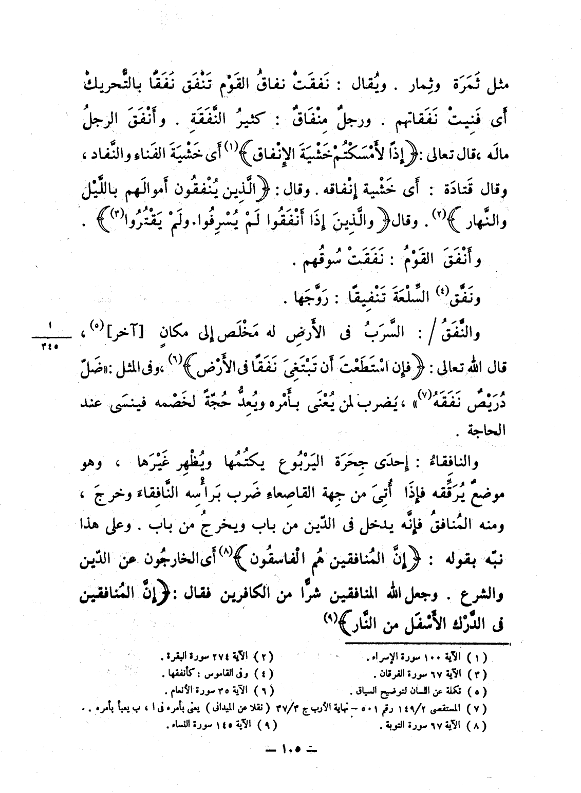 مثل ثَمَرَة وثِمار. ويُقال: نَفقَتْ نفاقُ القَوْم تَنْفَق نَفَقاً بالتَّحريكْ أَى فَنِيتْ نَفَقاتهم. ورجلٌ مِنْفَاقٌ: كثيرُ النَّفَقَةِ. وأَنْفَقَ الرجلُ مالَه، قال تعالى: {إِذاً لأمْسَكْتُمْ خَشْيَةَ الإنفاق} أى خَشْيَةَ الفَناءِ والنَّفاد، وقال قتادَة: أَى خشْية إِنْفاقه. وقال {الذين يُنْفِقُونَ أَمْوَالَهُمْ بالليل والنهار} . وقال {والذين إِذَآ أَنفَقُواْ لَمْ يُسْرِفُواْ وَلَمْ يَقْتُرُواْ} .