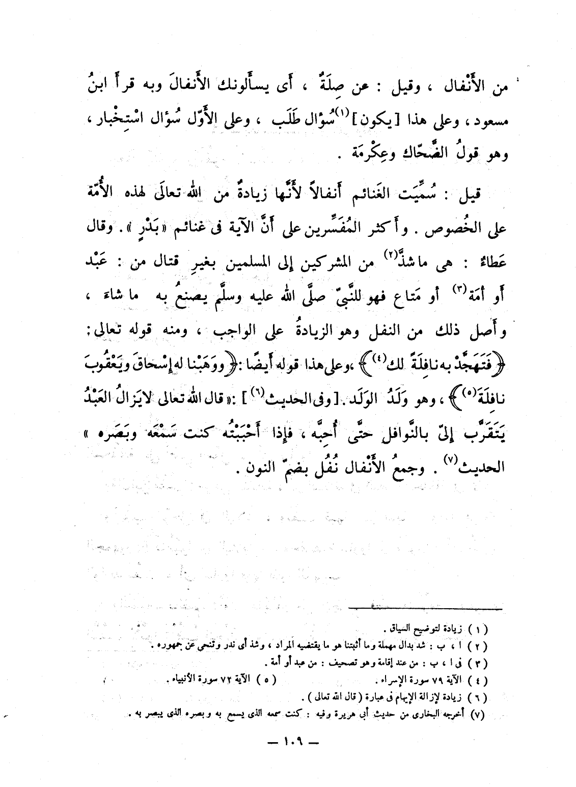 قيل: سُمِّيَت الغَنائم أَنفالاً لأَنَّها زيادةٌ من الله تعالَى لهذه الأُمّة على الخُصوص. وأَكثر المُفَسِّرين على أَنَّ الآية فى غنائم "بَدْرٍ". وقال عَطاءٌ: هى ما شذَّ من المشركين إِلى المسلمين بغيرِ قتال من: عَبْد أَو أَمة أو مَتاع فهو للنَّبىّ صلَّى الله عليه وسلَّم يصنعُ به ما شاءَ، وأَصل ذلك من النفل وهو الزيادةُ على الواجب، ومنه قوله تعالى: {فَتَهَجَّدْ بِهِ نَافِلَةً لَّكَ} ، وعلى هذا قوله أَيضاً: {وَوَهَبْنَا لَهُ إِسْحَاقَ وَيَعْقُوبَ نَافِلَةً} ، وهو وَلَدُ الوَلَد [وفى الحديث] : "قال الله تعالى لا يَزالُ العَبْدُ يَتَقَرَّب إِلّى بالنَّوافل حتَّى أُحِبَّه، فإِذا أَحْبَبْتُه كنت سَمْعَه وبَصَره" الحديث. وجمعُ الأَنْفال نُفُل بضمّ النون.