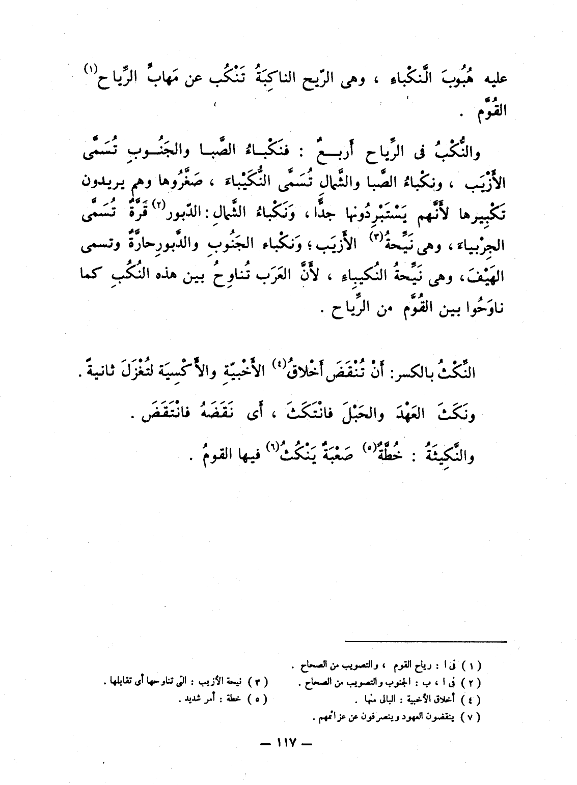 والنُّكْبُ فى الرِّياح أَربعٌ: فنَكْباءُ الصَّبا والجَنُوبِ تُسَمَّى الأَزْيَب، ونكْبَاءُ الصَّبا والشَّمالِ تُسَمَّى النُّكَيْباءَ، صَغَّرُوها وهم يريدون تَكْبيرها لأَنَّهم يَسْتَبْرِدُونها جدّاً، وَنَكْباءُ الشَّمالِ: الدّبور قَرَّةٌ تُسَمَّى الجِرْبياءَ، وهى نَيِّحةُ الأَزيَب، وَنكْباءِ الجَنُوبِ والدَّبورِ حارَّةٌ وتسمى الهَيْفَ، وهى نَيِّحةُ النُكيبِاءِ، لأَنَّ العَرَب تُناوِحُ بين هذه النُكُبِ كما ناوَحُوا بين القُوَّم من الرِّياح.