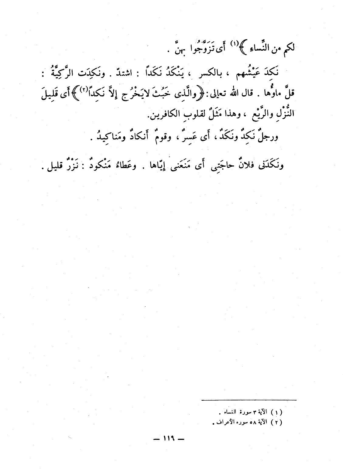 نَكِدَ عَيْشُهم، بالكسر، يَنْكَدُ نَكَداً: اشتدّ. ونَكِدَت الرَّكِيَّةُ: قلَّ ماؤُها. قال الله تعالى: {والذي خَبُثَ لاَ يَخْرُجُ إِلاَّ نَكِداً} أَى قَلِيلَ النُّزْلِ والرَّيْع، وهذا مَثَلٌ لقلوبِ الكافرين.