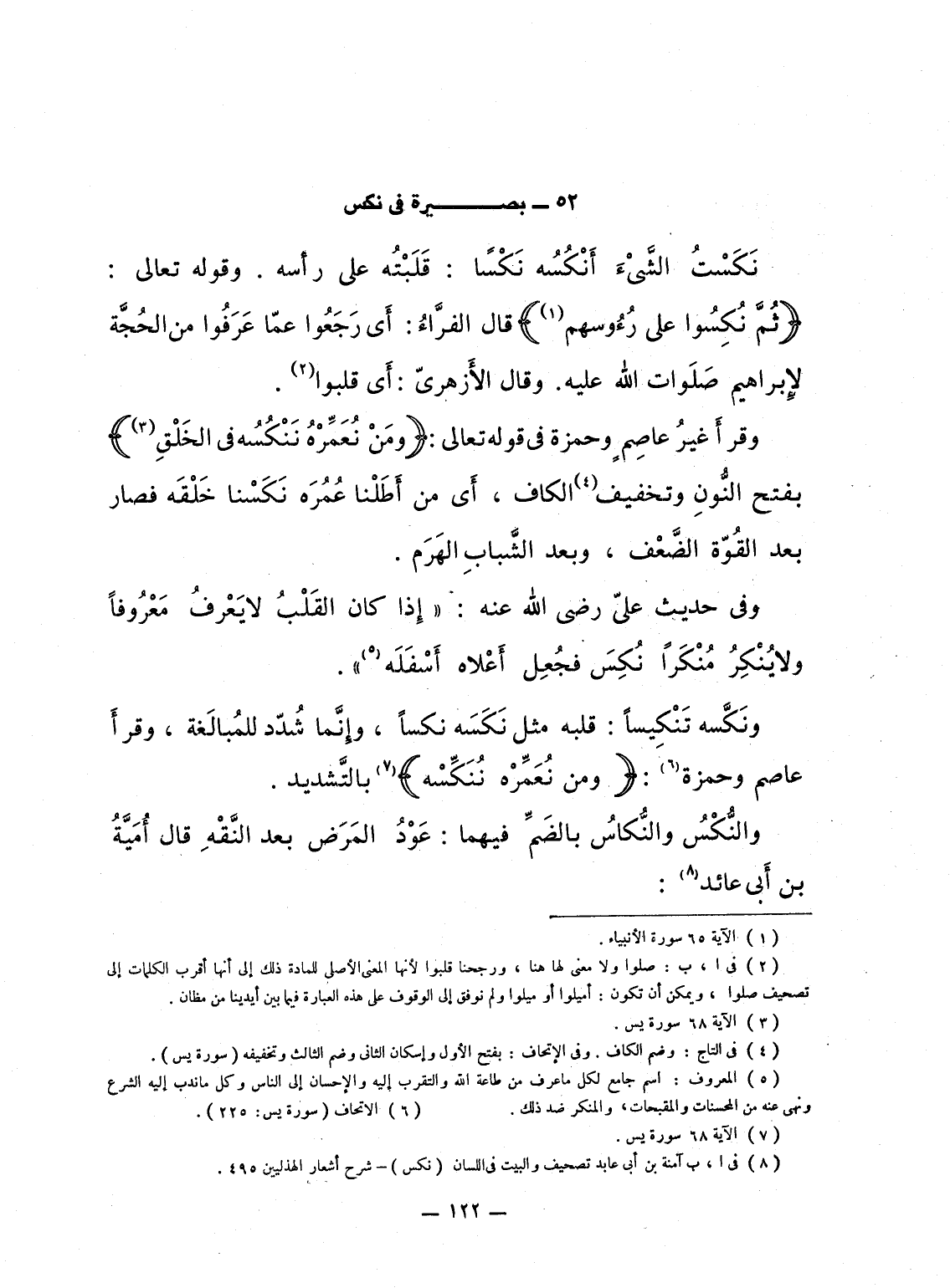 وقرأَ غيرُ عاصِمٍ وحمزة فى قوله تعالى: {ومَنْ نُعَمِّرْهُ نُنَكِّسْهُ فى الخَلْقِ} بفتح النُّون وتخفيف الكاف، أَى من أَطَلْنا عُمُرَه نَكَسْنا خَلْقَه فصار بعد القٌوّة الضَّعف، وبعد الشَّبابِ الهَرَم.