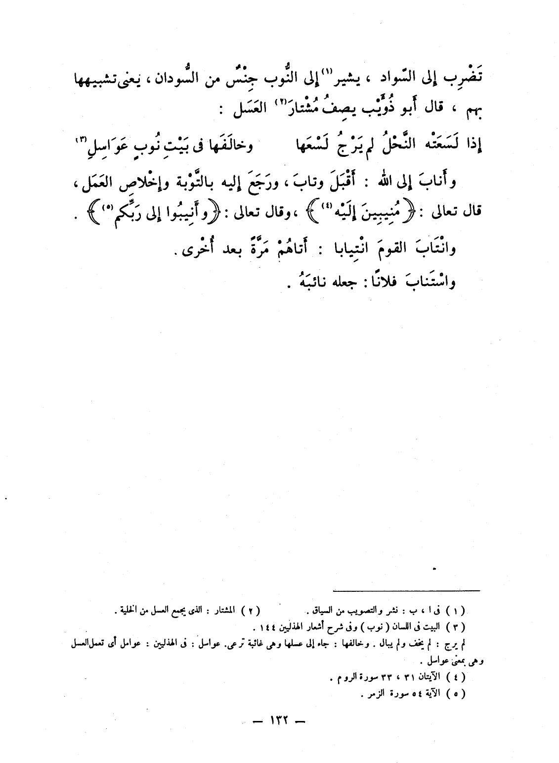 تَضْرِب إِلى السّواد، يشير إِلى النُّوب جِنْسٌ من السُّودان، يعنى تشبيهها بهم، قال أَبو ذُؤَيْب يصِفُ مُشْتارَ العَسَل: