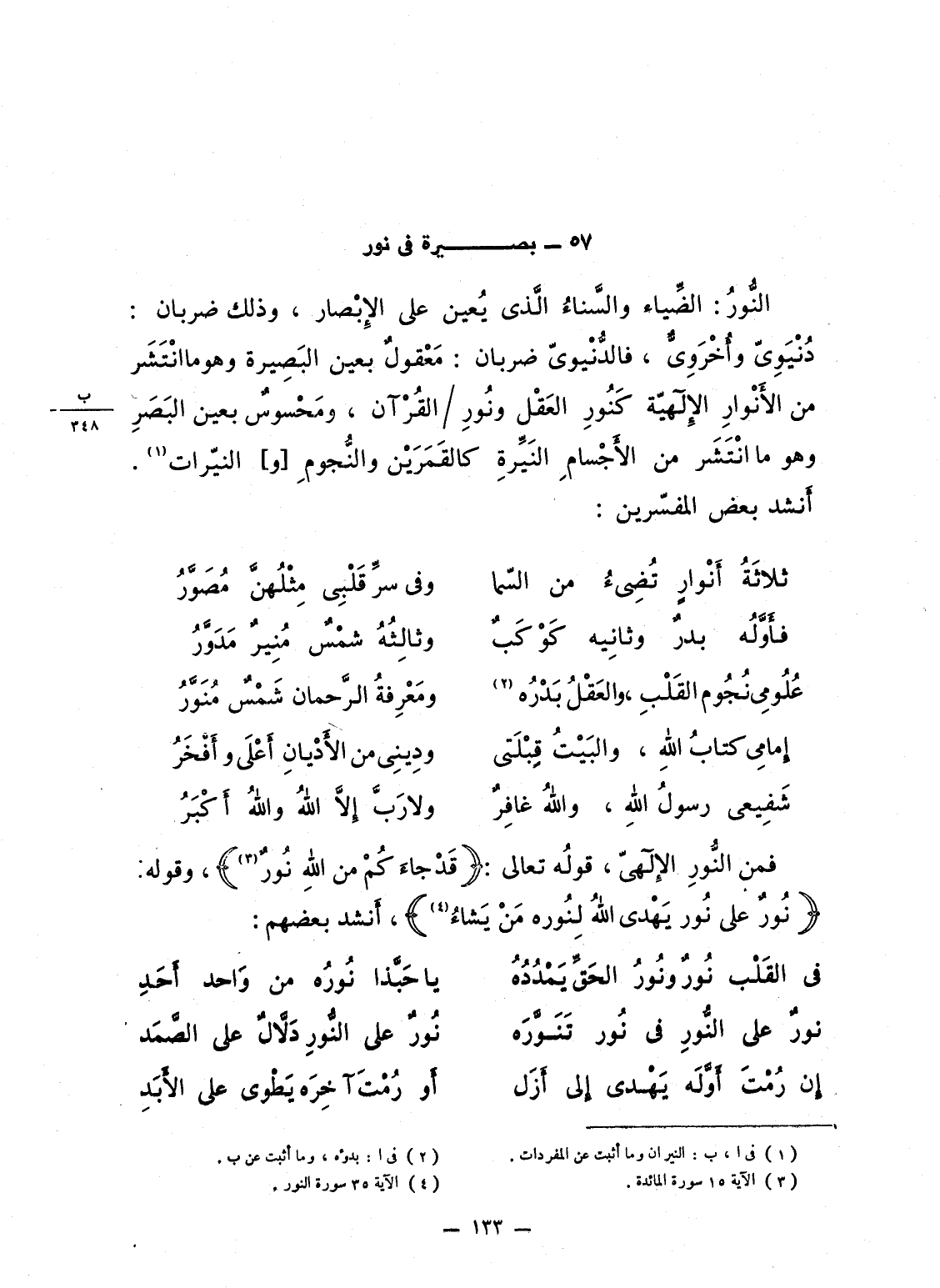 فمن النُّورِ الإِلهىّ، قولُه تعالى: {قَدْ جَآءَكُمْ مِّنَ الله نُورٌ} ، وقوله: {نُّورٌ على نُورٍ يَهْدِي الله لِنُورِهِ مَن يَشَآءُ} ، أَنشد بعضهم:
