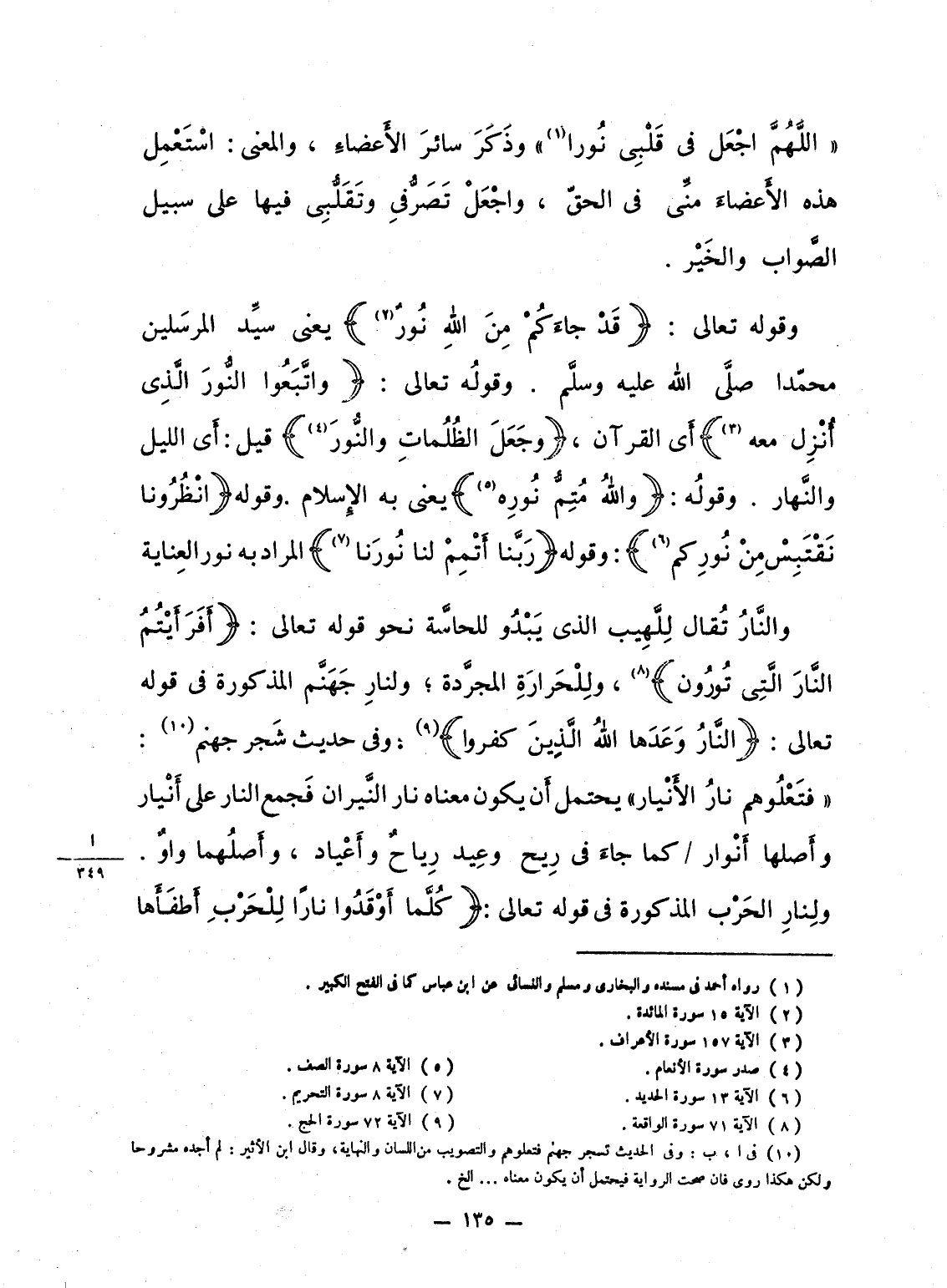 "اللَّهُمَّ اجْعَل فى قَلْبِى نُوراً" وذَكَرَ سائرَ الأَعضاءِ، والمعنى: اسْتَعْمِل هذه الأَعضاءَ منِّى فى الحقّ، واجْعَلْ تَصَرُّفِى وتَقَلُّبِى فيها على سبيل الصَّواب والخَيْر.