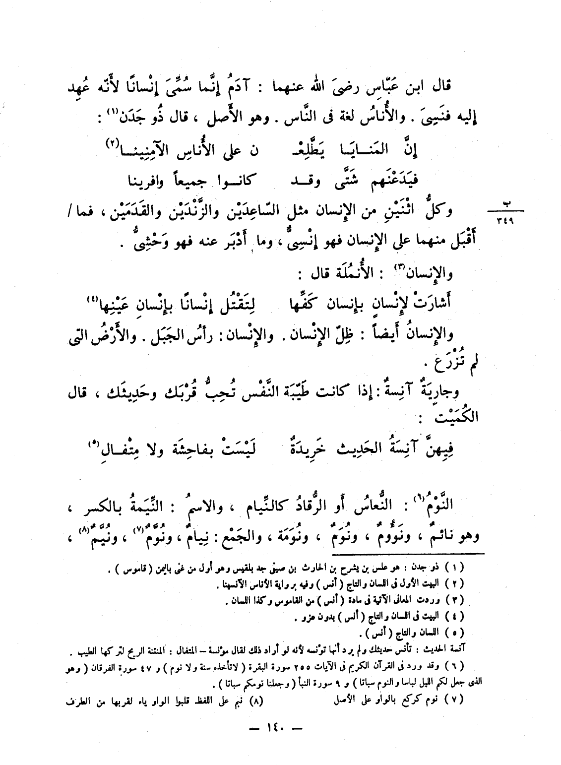 قال ابن عَبّاس رضىَ الله عنهما: آدَمُ إِنَّما سُمِّىَ إِنْساناً لأَنّه عُهِد إِليه فنَسِىَ، والأُناسُ لغة فى النَّاس. وهو الأَصل، قال ذُو جَدَن: