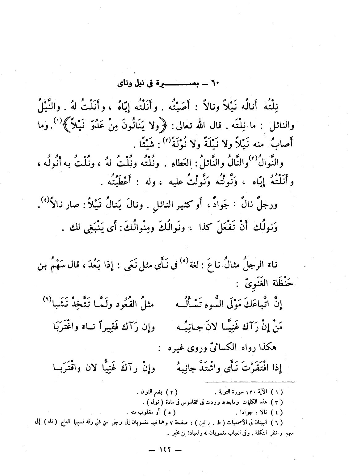 نِلْتُه أَنالُه نَيْلاً ونالاً: أَصَبْتُه. وأَنَلْتُه إِيّاهُ، وأَنَلْتُ لهُ. والنَّيْلُ والنائل: ما نِلْتَه، قال الله تعالى: {وَلاَ يَنَالُونَ مِنْ عَدُوٍّ نَّيْلاً} . وما أَصابُ منه نَيْلاً ولا نَيْلَةً ولا نُوْلَةً. شَيْئاً.