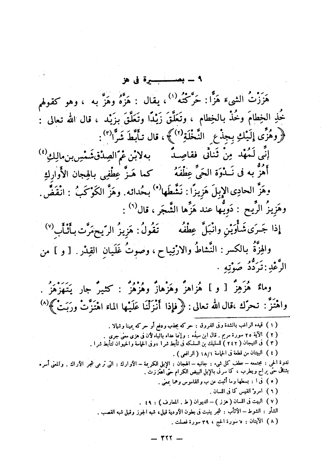 هَزَزْتُ الشىءَ هَزّاً: حَرَّكْتُه، يقال: هَزَّهُ وهَزَّ به، وهو كقولهم خُذِ الخِطامَ وخُذْ بالخِطام، وتَعَلَّقَ زَيْداً وتَعَلَّقَ بزَيْد، قال الله تعالى: {وهزى إِلَيْكِ بِجِذْعِ النخلة} ، قال تأَبَّطَ شَرّاً: