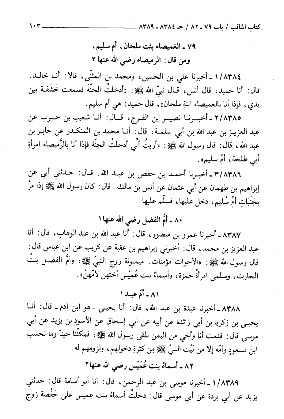 8384 - أخبرنا علي بن الحسين ومحمد بن المثنى قالا أنا خالد قال أنا حميد قال أنس قال نبي الله صلى الله عليه و سلم : أدخلت الجنة فسمعت خشفة بين يدي فإذا أنا بالغميصاء ابنة ملحان قال حميد هي أم سليم