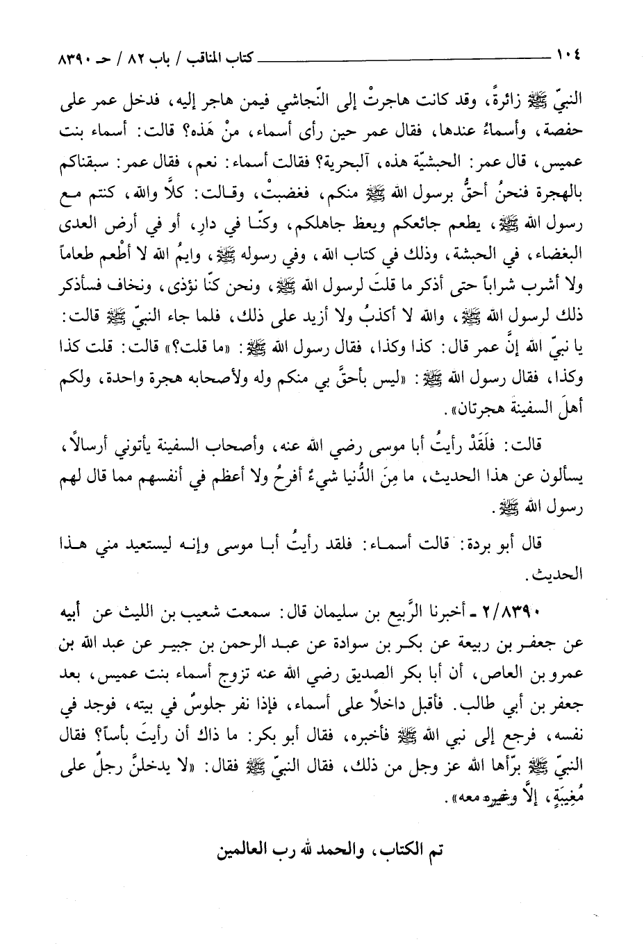 8390 - أخبرنا الربيع بن سليمان قال سمعت شعيب بن الليث عن أبيه عن جعفر بن ربيعة عن بكر بن سوادة عن عبد الرحمن بن جبير عن عبد الله بن عمرو بن العاص : أن أبا بكر الصديق رضي الله عنه تزوج أسماء بنت عميس بعد جعفر بن أبي طالب فأقبل داخلا على أسماء فإذا نفر جلوس في بيته فوجد في نفسه فرجع إلى نبي الله صلى الله عليه و سلم فأخبره فقال أبو بكر ما ذاك أن رأيت بأسا فقال النبي صلى الله عليه و سلم برأها الله عز و جل من ذلك فقال النبي صلى الله عليه و سلم فقال لا يدخلن رجل على مغيبة إلا وغيره تم الكتاب والحمد لله رب العالمين [ ص 105 ] سيدنا محمد وآله وصحبه وسلم تسليما عونك يا رب