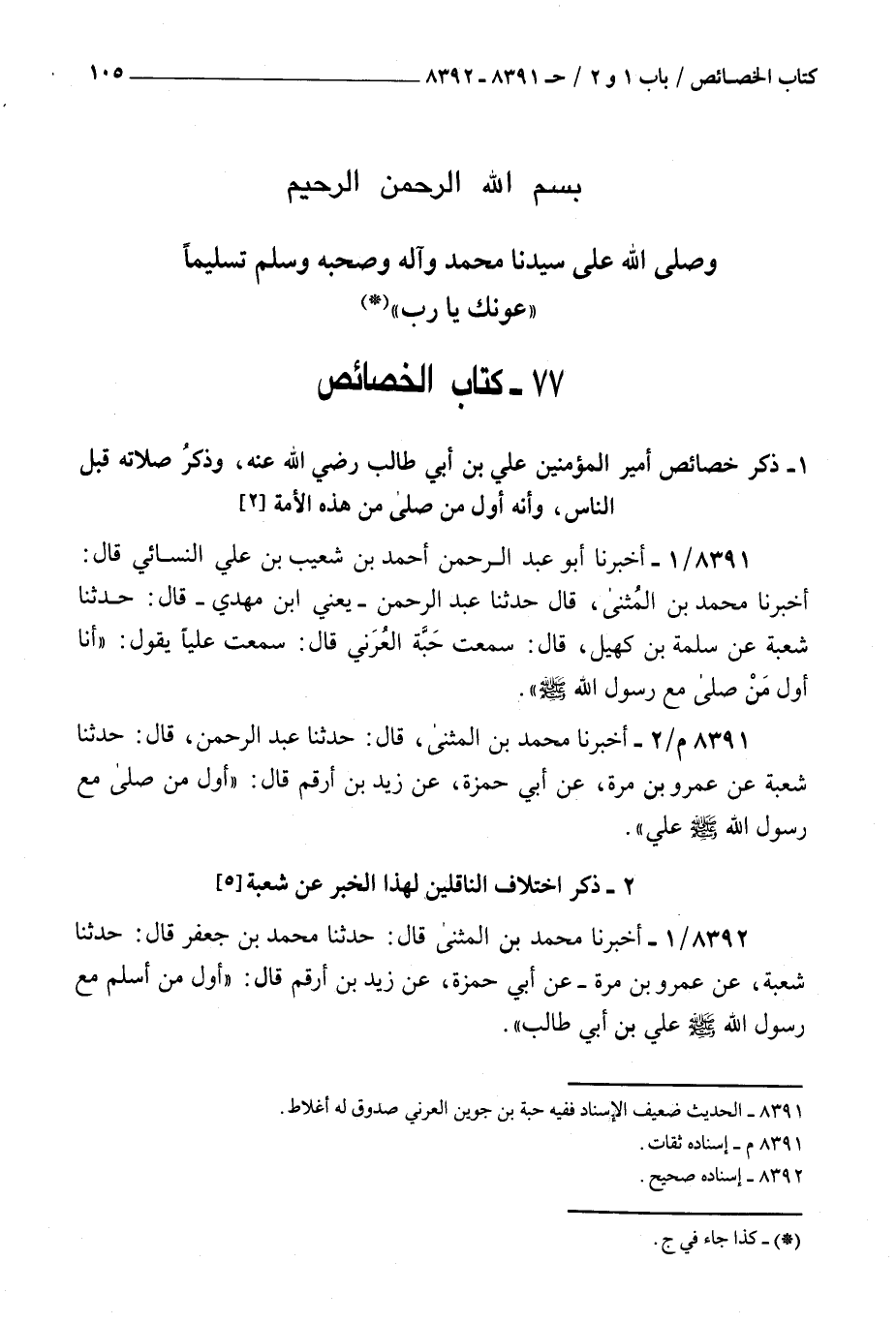 8391 - أخبرنا أبو عبد الرحمن أحمد بن شعيب بن علي النسائي قال أخبرنا محمد بن المثنى قال حدثنا عبد الرحمن يعني بن مهدي قال حدثنا شعبة عن سلمة بن كهيل قال سمعت حبة العرني قال سمعت عليا يقول : أنا أول من صلى مع رسول الله صلى الله عليه و سلم
