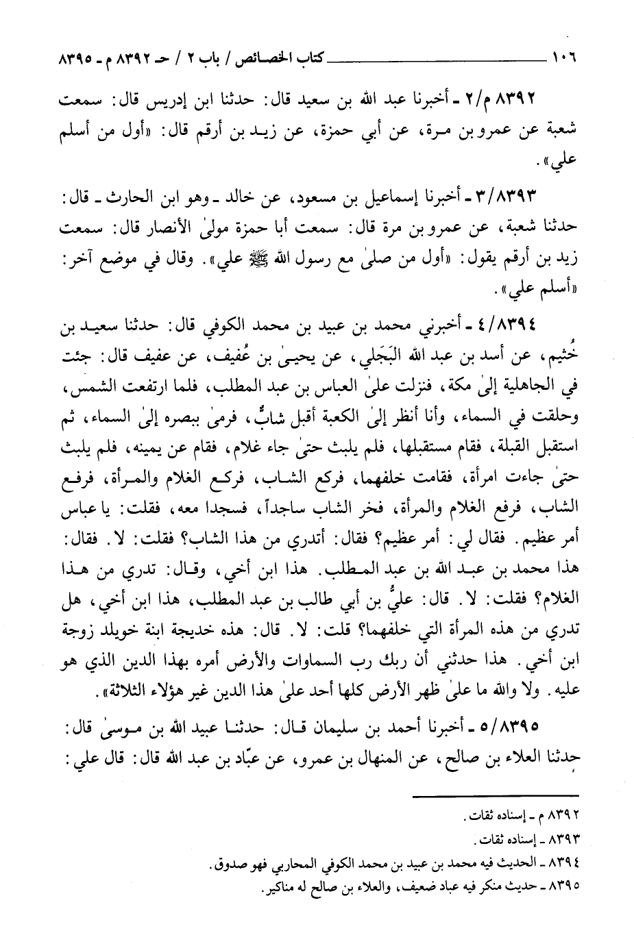 8394 - أخبرني محمد بن عبيد بن محمد الكوفي قال حدثنا سعيد بن خثيم عن أسد بن عبد الله البجلي عن يحيى بن عفيف عن عفيف قال : جئت في الجاهلية إلى مكة فنزلت على العباس بن عبد المطلب فلما ارتفعت الشمس وحلقت في السماء وأنا أنظر إلى الكعبة أقبل شاب فرمى ببصره إلى السماء ثم استقبل القبلة فقام مستقبلها فلم يلبث حتى جاء غلام فقام عن يمينه فلم يلبث حتى جاءت امرأة فقامت خلفها فركع الشاب فركع الغلام والمرأة فرفع الشاب فرفع الغلام والمرأة فخر الشاب ساجدا فسجد معه فقلت يا عباس أمر عظيم فقال لي أمر عظيم فقال أتدري من هذا الشاب فقلت لا فقال هذا محمد بن عبد الله بن عبد المطلب هذا بن أخي وقال تدري من هذا الغلام فقلت لا قال علي بن أبي طالب بن عبد المطلب هذا بن أخي هل تدري من هذه المرأة التي خلفهما قلت لا قال هذه خديجة ابنة خويلد زوجة بن أخي هذا حدثني أن ربك رب السماوات والأرض أمره بهذا الدين الذي هو عليه ولا والله ما على ظهر الأرض كلها أحد على هذا الدين غير هؤلاء الثلاثة
