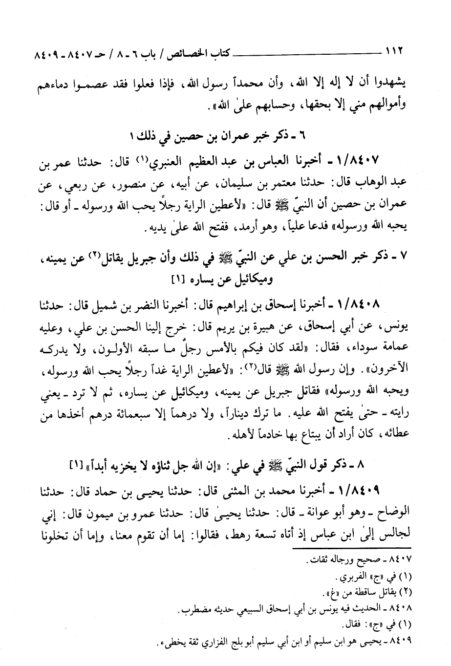 8407 - أخبرنا العباس بن عبد العظيم العنبري قال حدثنا عمر بن عبد الوهاب قال حدثنا معتمر بن سليمان عن أبيه عن منصور عن ربعي عن عمران بن حصين أن النبي صلى الله عليه و سلم قال : لأعطين الراية رجلا يحب الله ورسوله أو قال يحبه الله ورسوله فدعا عليا وهو أرمد ففتح الله على يديه