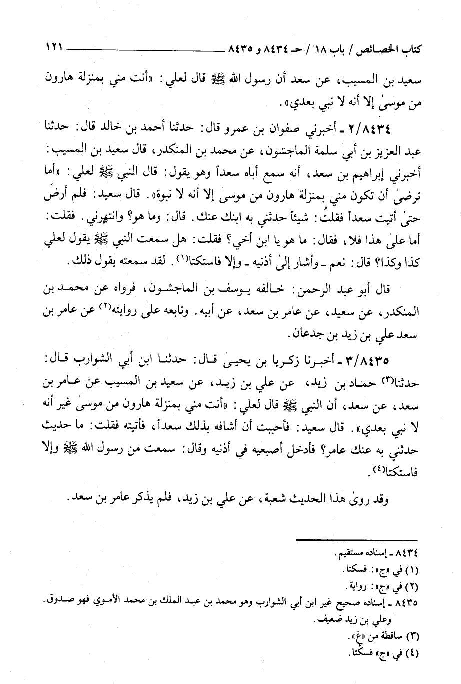 8434 - أخبرني صفوان بن عمرو قال حدثنا أحمد بن خالد قال حدثنا عبد العزيز بن أبي سلمة الماجشون عن محمد بن المنكدر قال سعيد بن المسيب أخبرني إبراهيم بن سعد أنه سمع أباه سعدا وهو يقول قال النبي صلى الله عليه و سلم لعلي : أما ترضى أن تكون مني بمنزلة هارون من موسى إلا أنه لا نبوة قال سعيد فلم أرض حتى أتيت سعدا فقلت شيئا حدثني به ابنك عنك قال وما هو وانتهرني فقلت أما على هذا فلا فقال ما هو يا بن أخي فقلت هل سمعت النبي صلى الله عليه و سلم يقول لعلي كذا وكذا قال نعم وأشار إلى أذنيه وإلا فاستكتا لقد سمعته يقول ذلك قال أبو عبد الرحمن خالفه يوسف بن الماجشون فرواه عن محمد بن المنكدر عن سعيد عن عامر بن سعد عن أبيه وتابعه على روايته عن عامر بن سعد علي بن زيد بن جدعان
