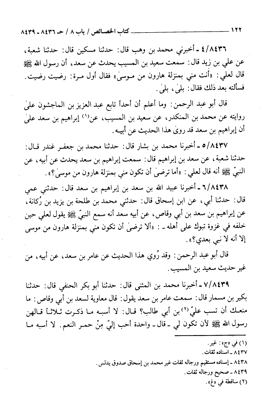 8437 - أخبرنا محمد بن بشار قال حدثنا محمد بن جعفر غندر قال حدثنا شعبة عن سعد بن إبراهيم قال سمعت إبراهيم بن سعد يحدث عن أبيه عن النبي صلى الله عليه و سلم أنه قال لعلي : أما ترضى أن تكون مني بمنزلة هارون من موسى
