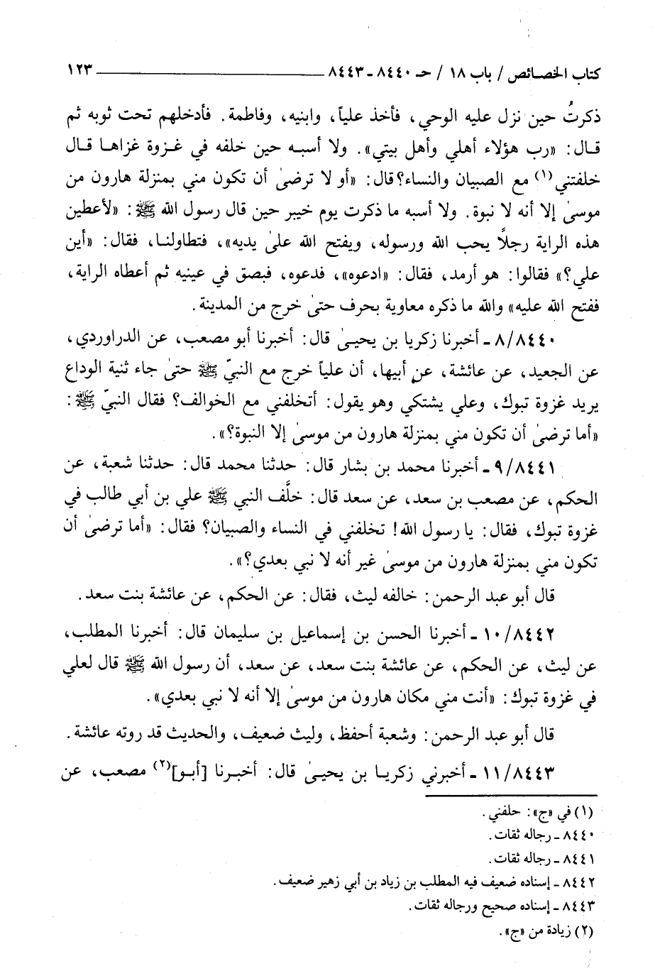 8443 - أخبرني زكريا بن يحيى قال أخبرنا أبو مصعب عن الدراوردي عن الجعيد عن عائشة عن أبيها : أن عليا خرج مع النبي صلى الله عليه و سلم حتى جاء ثنية الوداع يريد غزوة تبوك وعلي يشتكي وهو يقول أتخلفني مع الخوالف فقال النبي صلى الله عليه و سلم أما ترضى أن تكون مني بمنزلة هارون من موسى إلا النبوة
