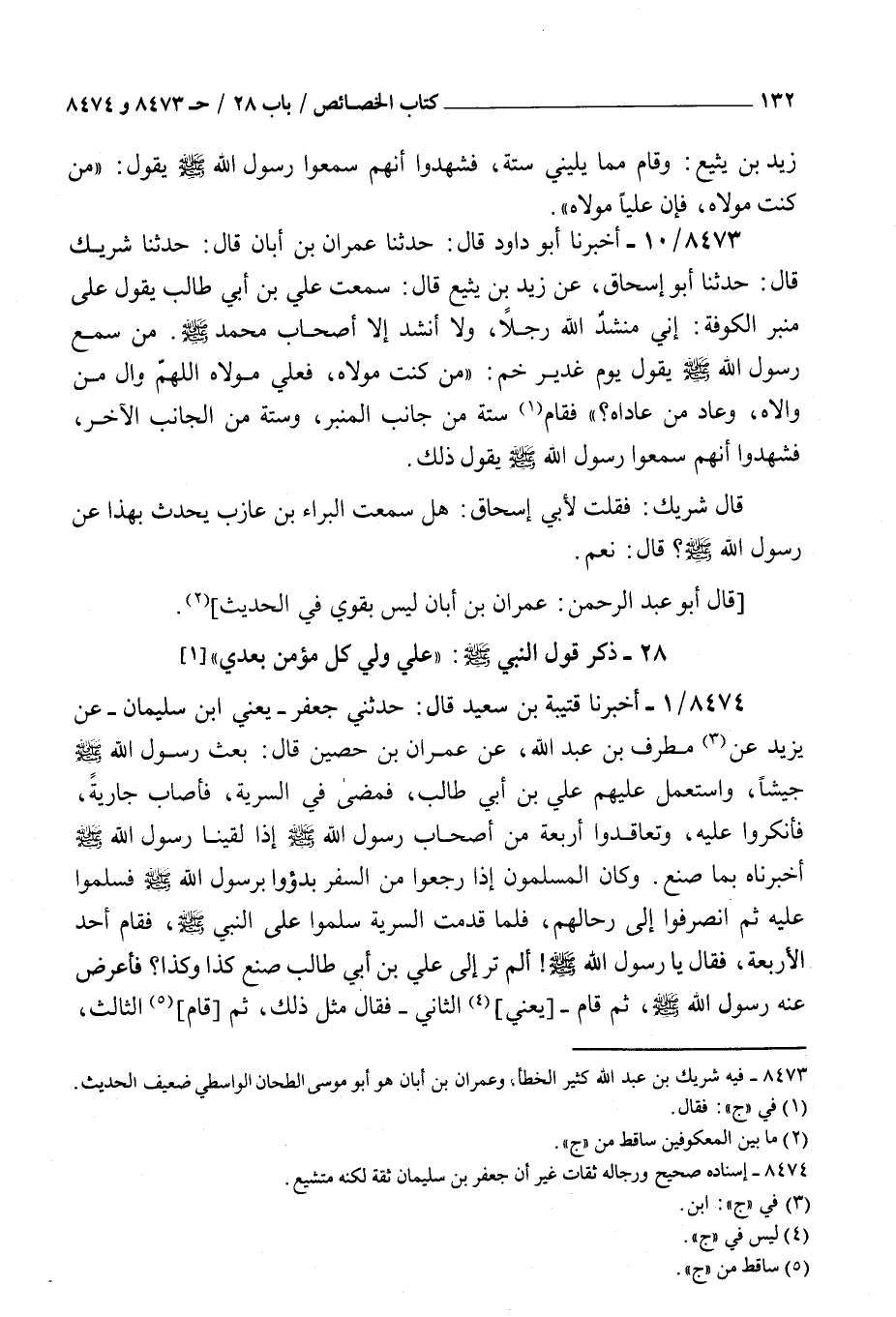 8473 - أخبرنا أبو داود قال حدثنا عمران بن أبان قال حدثنا شريك قال حدثنا أبو إسحاق عن زيد بن يثيع قال : سمعت علي بن أبي طالب يقول على منبر الكوفة إني منشد الله رجلا ولا أنشد إلا أصحاب محمد صلى الله عليه و سلم من سمع رسول الله صلى الله عليه و سلم يقول يوم غدير خم من كنت مولاه فعلي مولاه اللهم وال من والاه وعاد من عاداه فقام ستة من جانب المنبر وستة من الجانب الآخر فشهدوا أنهم سمعوا رسول الله صلى الله عليه و سلم يقول ذلك قال شريك فقلت لأبي إسحاق هل سمعت البراء بن عازب يحدث بهذا عن رسول الله صلى الله عليه و سلم قال نعم قال أبو عبد الرحمن عمران بن أبان ليس بقوي في الحديث