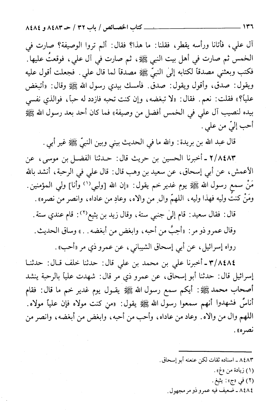 8484 - أخبرنا علي بن محمد بن علي قال حدثنا خلف قال حدثنا إسرائيل قال حدثنا أبو إسحاق عن عمرو ذي مر قال شهدت عليا بالرحبة ينشد أصحاب محمد صلى الله عليه و سلم أيكم سمع رسول الله صلى الله عليه و سلم يقول يوم غدير خم ما قال فقام أناس فشهدوا أنهم سمعوا رسول الله صلى الله عليه و سلم يقول : من كنت مولاه فإن عليا مولاه اللهم وال من والاه وعاد من عاداه وأحب من أحبه وابغض من أبغضه وانصر من نصره