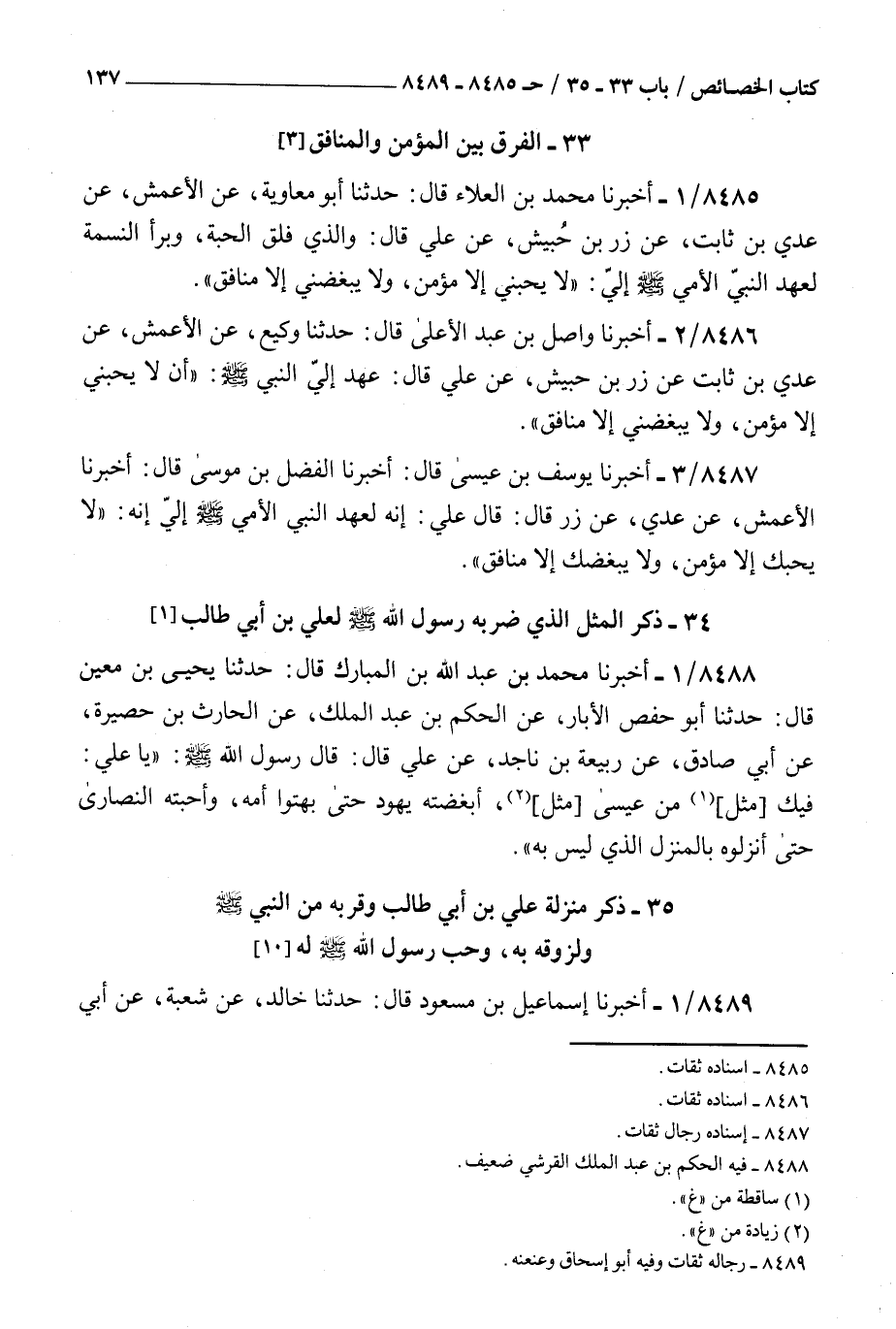 8485 - أخبرنا محمد بن العلاء قال حدثنا أبو معاوية عن الأعمش عن عدي بن ثابت عن زر بن حبيش عن علي قال : والذي فلق الحبة وبرأ النسمة لعهد النبي الأمي صلى الله عليه و سلم إلي لا يحبني إلا مؤمن ولا يبغضني إلا منافق
