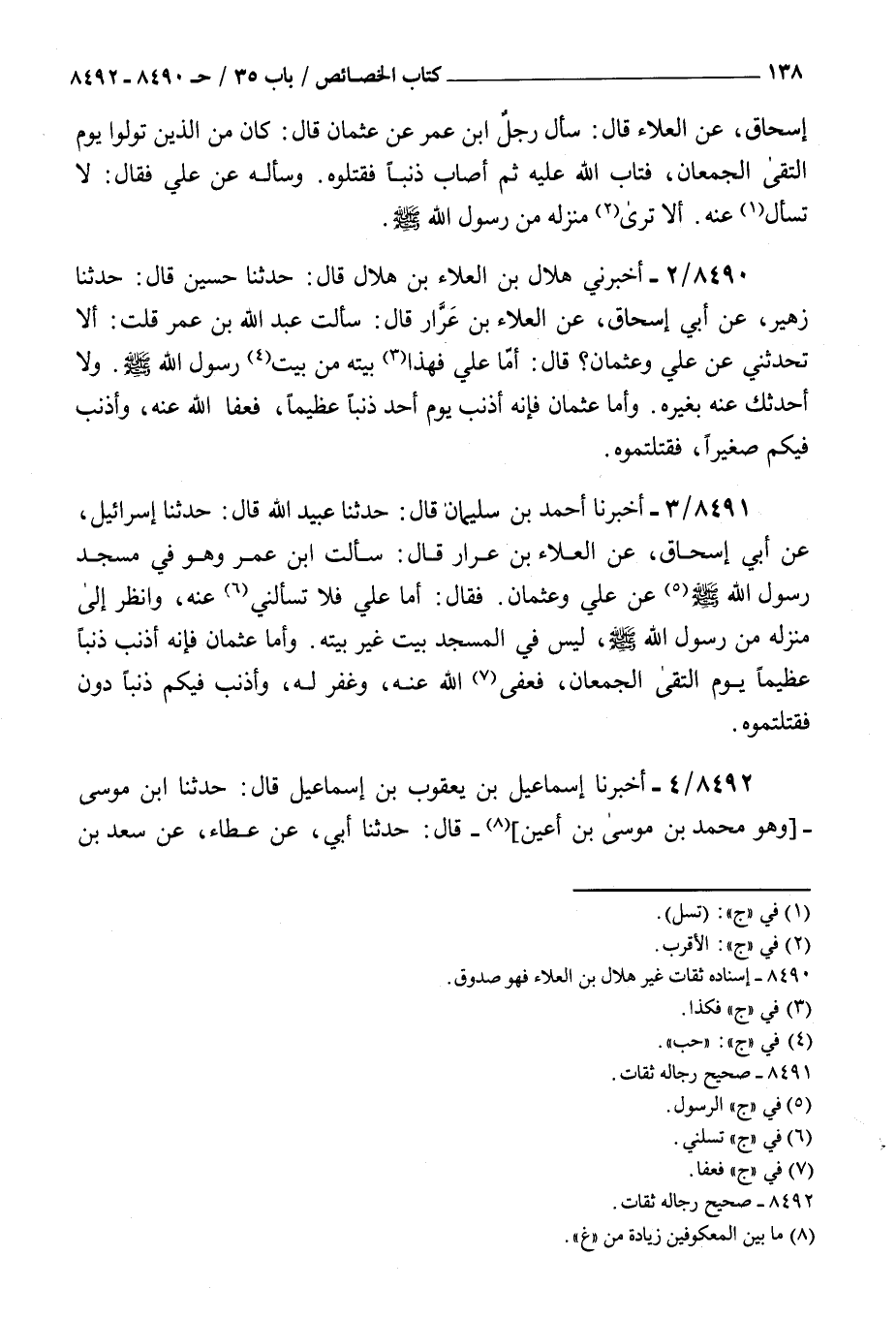 8491 - أخبرنا أحمد بن سليمان قال حدثنا عبيد الله قال حدثنا إسرائيل عن أبي إسحاق عن العلاء بن عرار قال : سألت بن عمر وهو في مسجد رسول الله صلى الله عليه و سلم عن علي وعثمان فقال أما علي فلا تسألني عنه وانظر إلى منزله من رسول الله صلى الله عليه و سلم ليس في المسجد بيت غير بيته وأما عثمان فإنه أذنب ذنبا عظيما يوم التقى الجمعان فعفى الله عنه وغفر له وأذنب فيكم ذنبا دون فقتلتموه