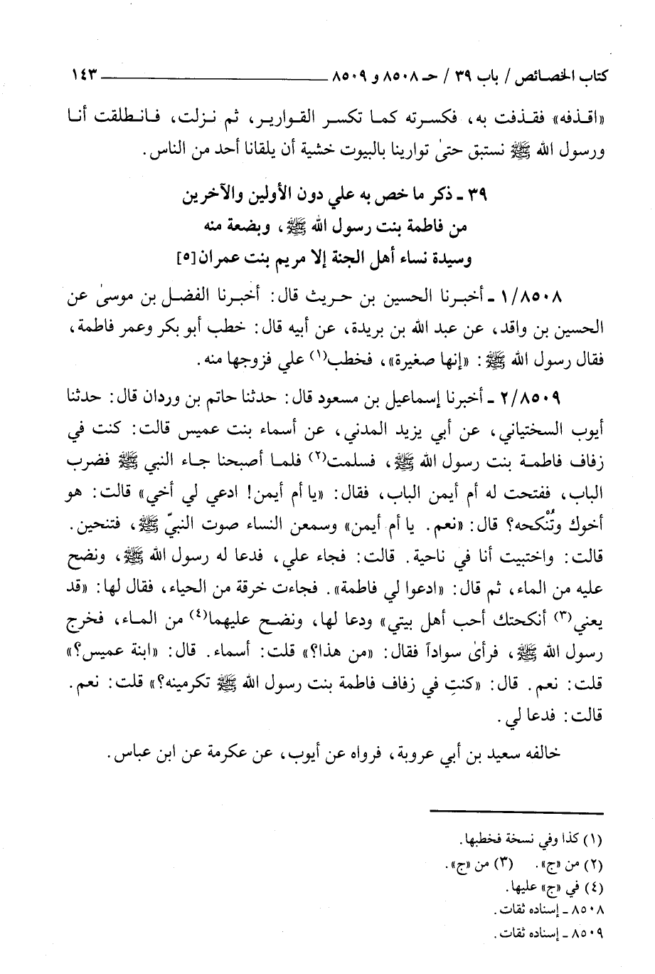 8509 - أخبرنا إسماعيل بن مسعود قال حدثنا حاتم بن وردان قال حدثنا أيوب السختياني عن أبي يزيد المدني عن أسماء بنت عميس قالت : كنت في زفاف فاطمة بنت رسول الله صلى الله عليه و سلم فسلمت فلما أصبحنا جاء النبي صلى الله عليه و سلم فضرب الباب ففتحت له أم أيمن الباب فقال يا أم أيمن أدعي لي أخي قالت هو أخوك وتنكحه قال نعم يا أم أيمن وسمعن النساء صوت النبي صلى الله عليه و سلم فتنحين قالت واختبيت أنا في ناحية قالت فجاء علي فدعا له رسول الله صلى الله عليه و سلم ونضح عليه من الماء ثم قال ادعوا لي فاطمة فجاءت خرقة من الحياء فقال لها قد يعني أنكحتك أحب أهل بيتي ودعا لها ونضح عليهما من الماء فخرج رسول الله صلى الله عليه و سلم فرأى سوادا فقال من هذا قلت أسماء قال ابنة عميس قلت نعم قال كنت في زفاف فاطمة بنت رسول الله صلى الله عليه و سلم تكرمينه قلت نعم قالت فدعا لي خالفه سعيد بن أبي عروبة فرواه عن أيوب عن عكرمة عن بن عباس