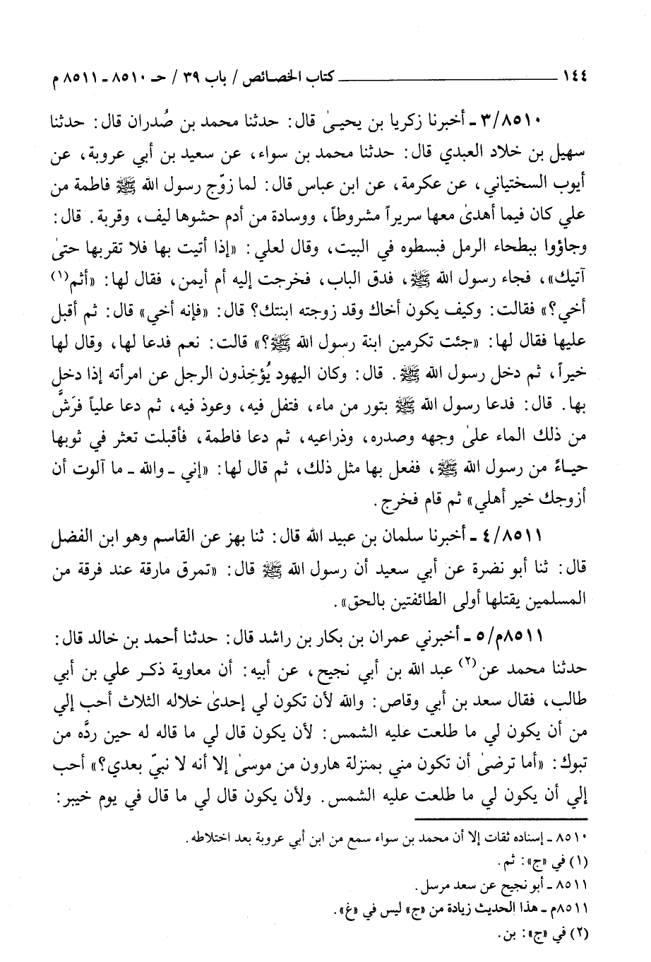 8511 - أخبرني عمران بن بكار بن راشد قال حدثنا أحمد بن خالد قال حدثنا محمد عن عبد الله بن أبي نجيح عن أبيه أن معاوية ذكر علي بن أبي طالب فقال سعد بن أبي وقاص والله لأن تكون لي إحدى خلاله الثلاث أحب إلي من أن يكون لي ما طلعت عليه الشمس لأن يكون قال لي : ما قاله له حين رده من تبوك أما ترضى أن تكون مني بمنزلة هارون من موسى إلا أنه لا نبي بعدي أحب إلي أن يكون لي ما طلعت عليه الشمس ولأن يكون قال لي ما قال في يوم خيبر لأعطين الراية رجلا يحب الله ورسوله ويحبه الله ورسوله يفتح الله على يديه ليس بفرار أحب إلي من أن يكون لي ما طلعت عليه الشمس ولأن أكون كنت صهره على ابنته لي منها من الولد ما له أحب إلي من أن يكون لي ما طلعت عليه الشمس