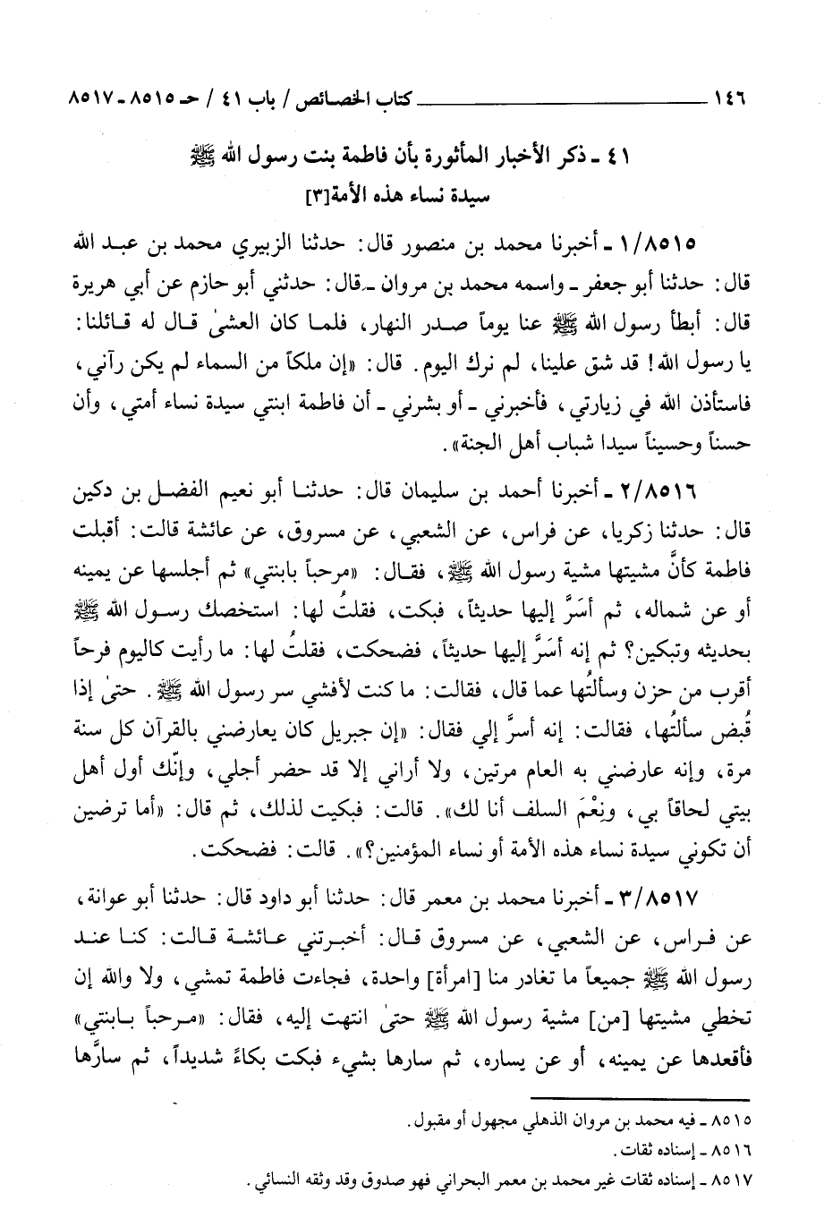 8516 - أخبرنا أحمد بن سليمان قال حدثنا أبو نعيم الفضل بن دكين قال حدثنا زكريا عن فراس عن الشعبي عن مسروق عن عائشة قالت : أقبلت فاطمة كأن مشيتها مشية رسول الله صلى الله عليه و سلم فقال مرحبا بابنتي ثم أجلسها عن يمينه أو عن شماله ثم أسر إليها حديثا فبكت فقلت لها استخصك رسول الله صلى الله عليه و سلم بحديثه وتبكين ثم إنه أسر إليها حديثا فضحكت فقلت لها ما رأيت كاليوم فرحا أقرب من حزن وسألتها عما قال فقالت ما كنت لأفشي سر رسول الله صلى الله عليه و سلم حتى إذا قبض سألتها فقالت إنه أسر إلي فقال إن جبريل كان يعارضني بالقرآن كل سنة مرة وإنه عارضي به العام مرتين ولا أراني إلا قد حضر أجلي وإنك أول أهل بيتي لحاقا بي ونعم السلف أنا لك قالت فبكيت لذلك ثم قال أما ترضين أن تكوني سيدة نساء هذه الأمة أو نساء المؤمنين قالت فضحكت