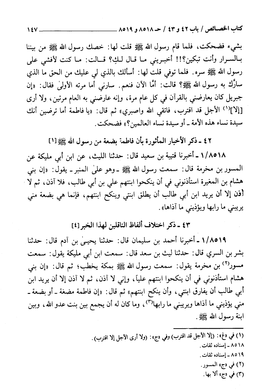 ( 42 ذكر الأخبار المأثورة بأن فاطمة بضعة من رسول الله صلى الله عليه و سلم )