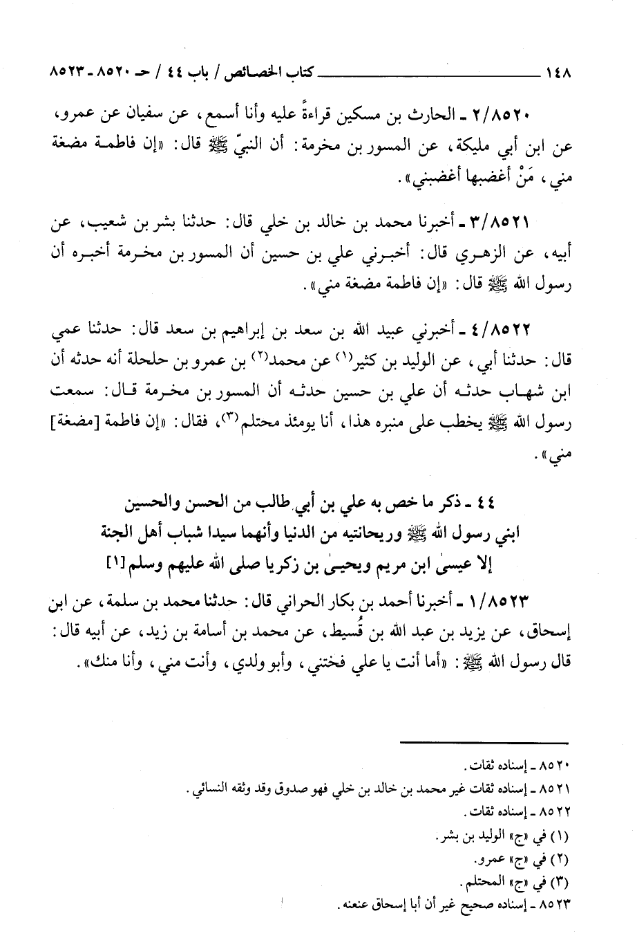 8523 - أخبرنا أحمد بن بكار الحراني قال حدثنا محمد بن سلمة عن بن إسحاق عن يزيد بن عبد الله بن قسيط عن محمد بن أسامة بن زيد عن أبيه قال قال رسول الله صلى الله عليه و سلم : أما أنت يا علي فختني وأبو ولدي وأنت مني وأنا منك